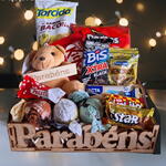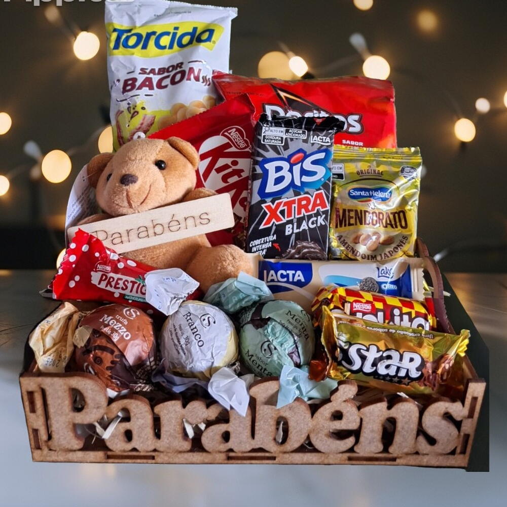 Cesta de Guloseimas com frase Parabens e mini Urso com plaquinha "Parabens"