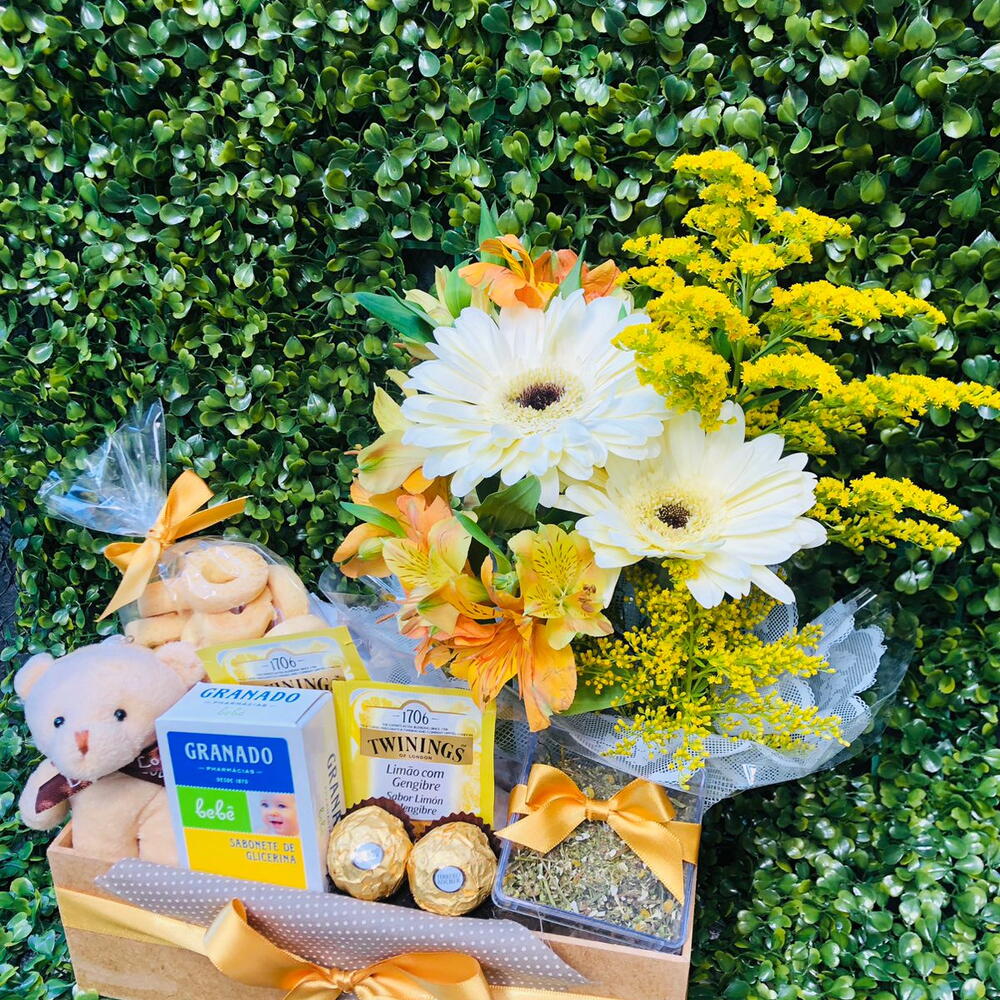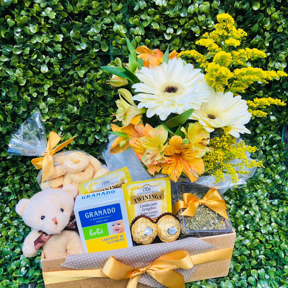 ✨ Cesta Maternidade Chá Carinho ✨ Um presente cheio de ternura, pensado para celebrar a chegada de um novo amor! 💛 Essa delicada cesta combina o aconchego do chá Twinings de limão com gengibre, o sabor dos biscoitinhos artesanais e o toque doce do Ferrero Rocher — acompanhados de um sabonete Granado bebê, um ursinho de pelúcia e um charmoso arranjo de flores naturais. 💛 Ideal para presentear mamães e recém-nascidos com afeto, conforto e um toque de elegância. Um mimo que transmite cuidado, carinho e amor em cada detalhe!