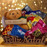 Cesta de Natal "Feliz Natal" com Chocolates e Ursinho "Te Adoro"
