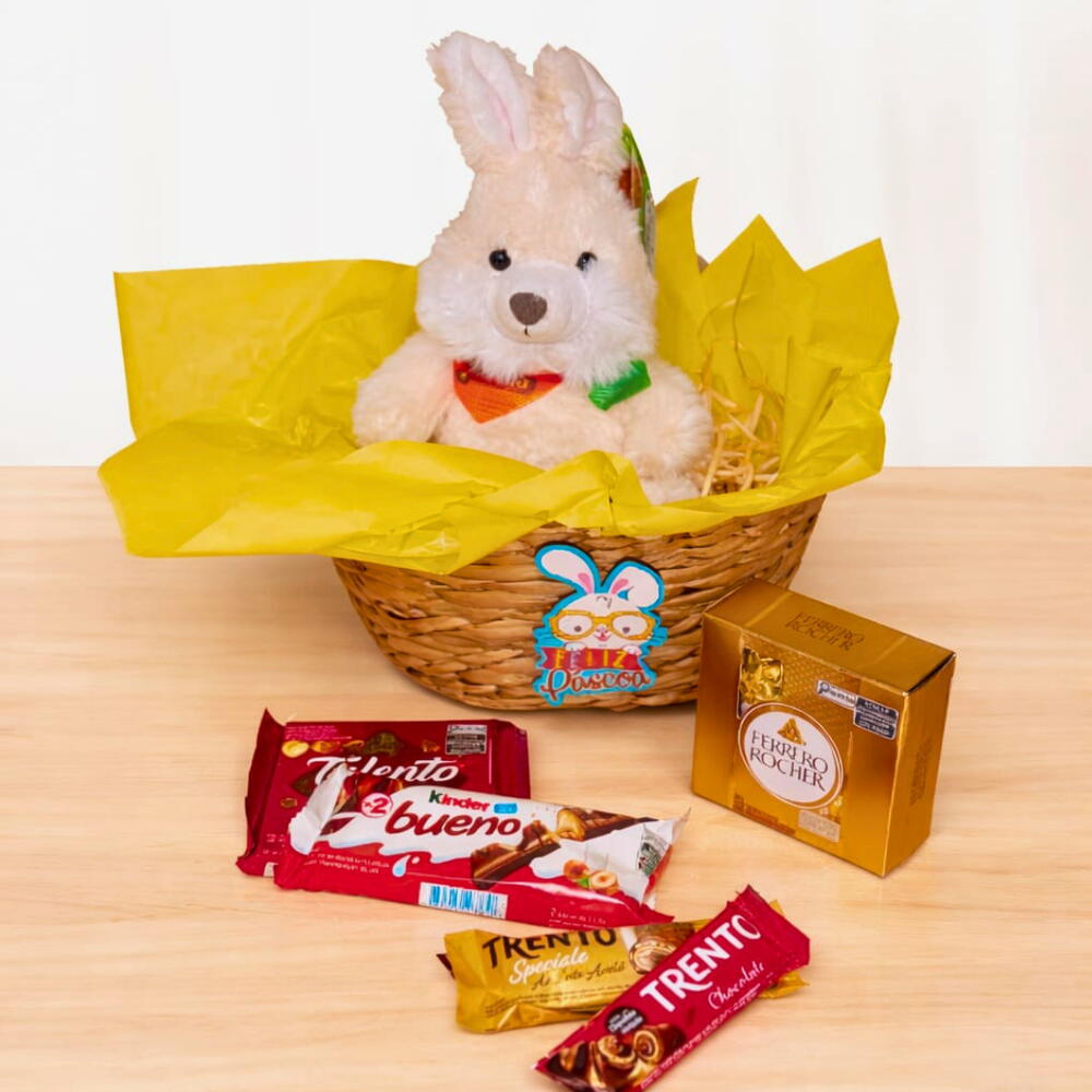 caixa de bombons ferrero rocher - 1 un. talento avelãs - 1 un. trento speciale ao leite com avelã - 1 un. trento chocolate ao leite - 1 un. coelho de pelúcia fizzy fec7187 - 1 un. kinder bueno com recheio de leite e avelãs - 1 un. cesta taboa com pick feliz páscoa - 1 un.