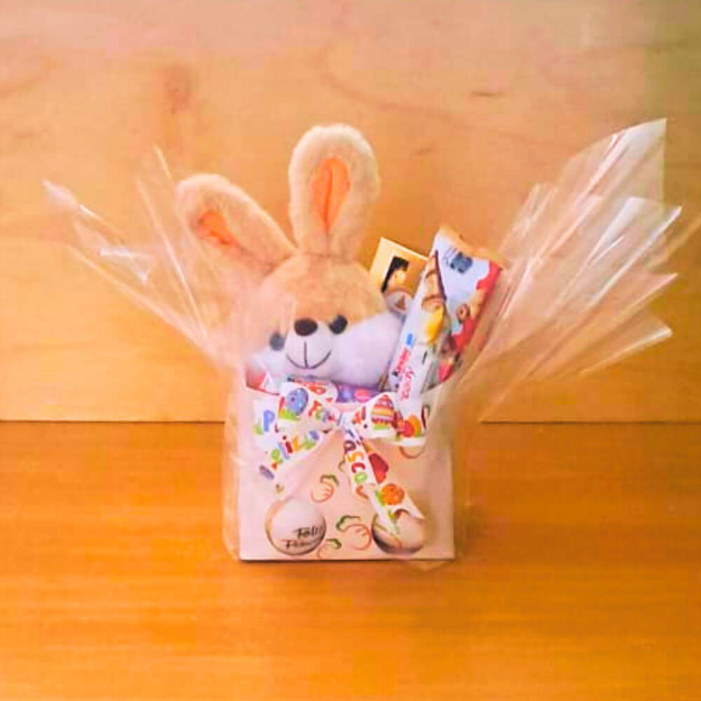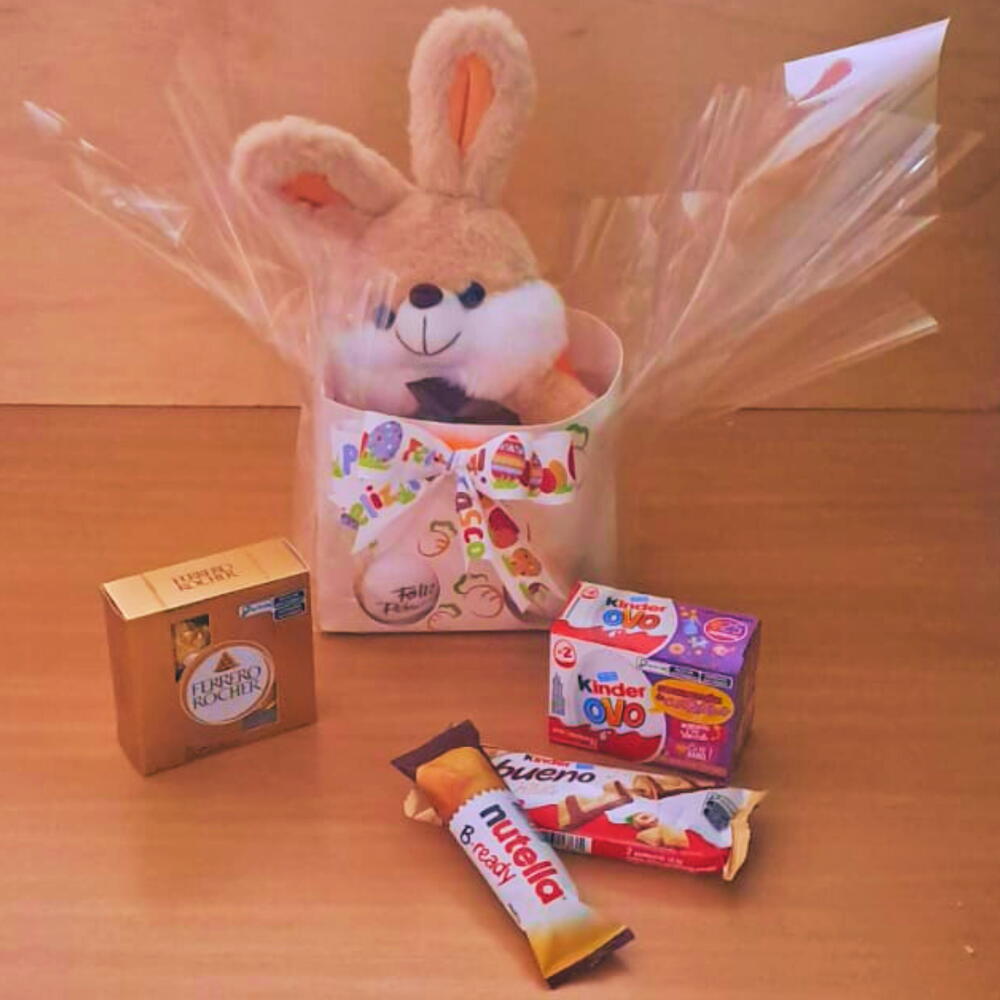 caixa de bombom ferrero rocher - 1 un. kinder bueno white - 1 un. nutella by ready - 1 un. coelho de pelúcia com sacolinha 20cm - 1 un. kinder ovo com 2 unidades - 1 un.