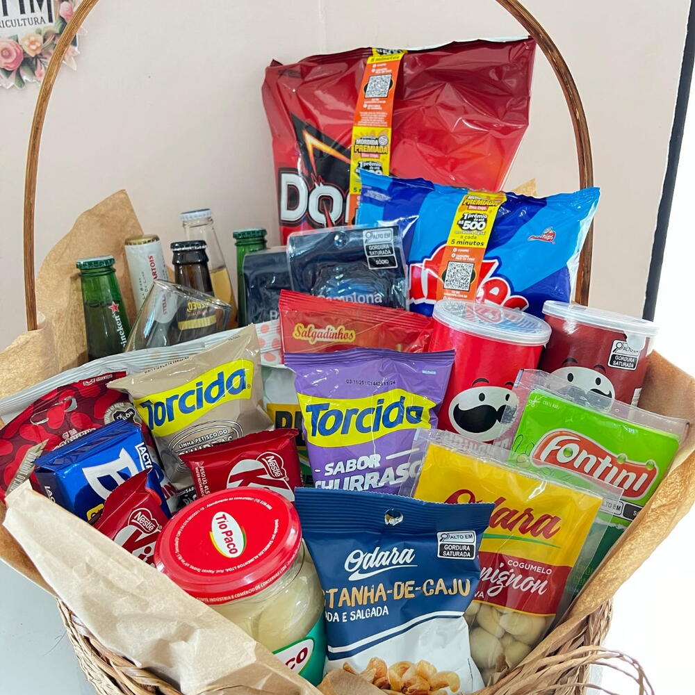 bis - 1 un. taça - 1 un. cesta - 1 un. laço - 1 un. kitkat - 2 un. torcida - 2 un. pringles - 2 un. doritos - 1 un. stella artois - 1 un. castanha de caju - 1 un. heineken - 2 un. budweiser - 1 un. embalagem celofane - 1 un. corona - 1 un. ruffles - 1 un. azeitonas verdes - 1 un. salaminhos - 2 un. amendoins cores - 4 un. palmito - 1 un. cogumelo champgnon - 1 un.