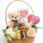 cesta de vime - 1 un. rosa artificiais - 4 un. bombons sortidos nestlé - 5 un. cartão te amo - 1 un. mini balão em formato de coração - 1 un. ursinho de pelucia 10cm - 1 un. chocolatge talento - 1 un.