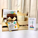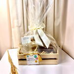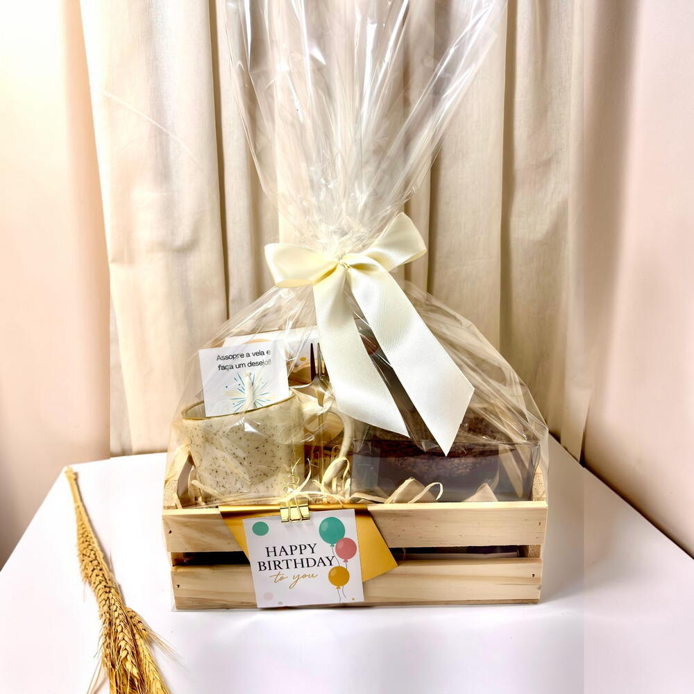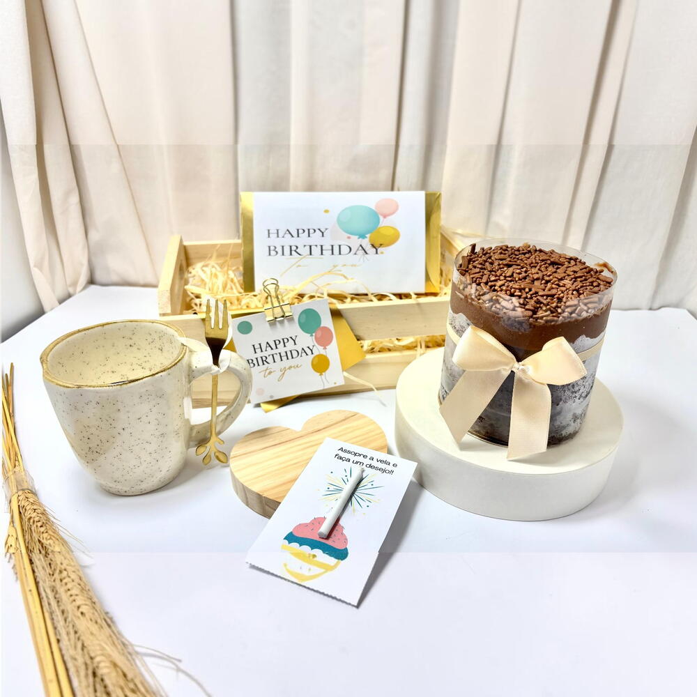Perfeita para celebrar aniversários Embalagem charmosa e pronta para presentear Uma forma única de dizer “feliz aniversário” 1 - Caixote de madeira 1 - Caneca Oxford Bege 1 - Coração de madeira 1 - Ferrero Rocher 1 - Garfo de sobremesa dourado 1 - Mini Bolo 1 - Mini cartão 1 - Prendedor de papel dourado