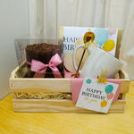 ferrero rocher - 1 un. caixote de madeira - 1 un. mini bolo de chocolate - 1 un. mini cartão - 1 un. prendedor de papel dourado - 1 un. garfo de sobremesa dourado - 1 un. caneca oxford bege - personalizada - 1 un.