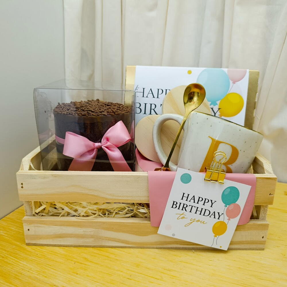 ferrero rocher - 1 un. caixote de madeira - 1 un. mini bolo de chocolate - 1 un. mini cartão - 1 un. prendedor de papel dourado - 1 un. garfo de sobremesa dourado - 1 un. caneca oxford personalizada - bege ou rosa - 1 un.