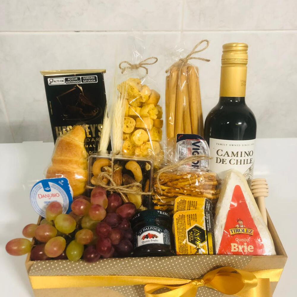 blister de mel - 2 un. uma caixa em mdf decorada com laço de fita - 1 un. uma porção de uvas - 1 un. uma mini geleia importada - 1 un. uma porção de grissinis - 1 un. uma porção de torradinhas temperadas - 1 un. uma barra de chocolate de boa qualidade - 1 un. uma caixinha em acrilico com porção de mix de nuts - 1 un. uma mini blister de cream cheese ou requeijão cremoso - 1 un. uma colher pra mel - 1 un. um blister de manteiga individual - 1 un. uma porção de biscoitinhos salgadinhos - 1 un. um mini croissant - 1 un. um pedaço de queijo nobre ( gouda - 1 un. brie ou gosgonzola ) - 1 un. um vinho tinto de boa qualidade 387ml - 1 un.