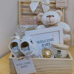 chá twinigs - 2 un. mini cartão - 1 un. sapatinho rn - 1 un. sabonete baby eudora - 1 un. porta retrato escrito "welcome baby" - 1 un. plaquinha em mdf escrito "com carinho" - 1 un. prendedor de papel dourado - 1 un. vela aromática - artemisia sensorial - 1 un. chocolate ferrero 1 un - 1 un. pote de vidro com biscoito amanteigados - 1 un. linda caixa de madeira com laço - 1 un.