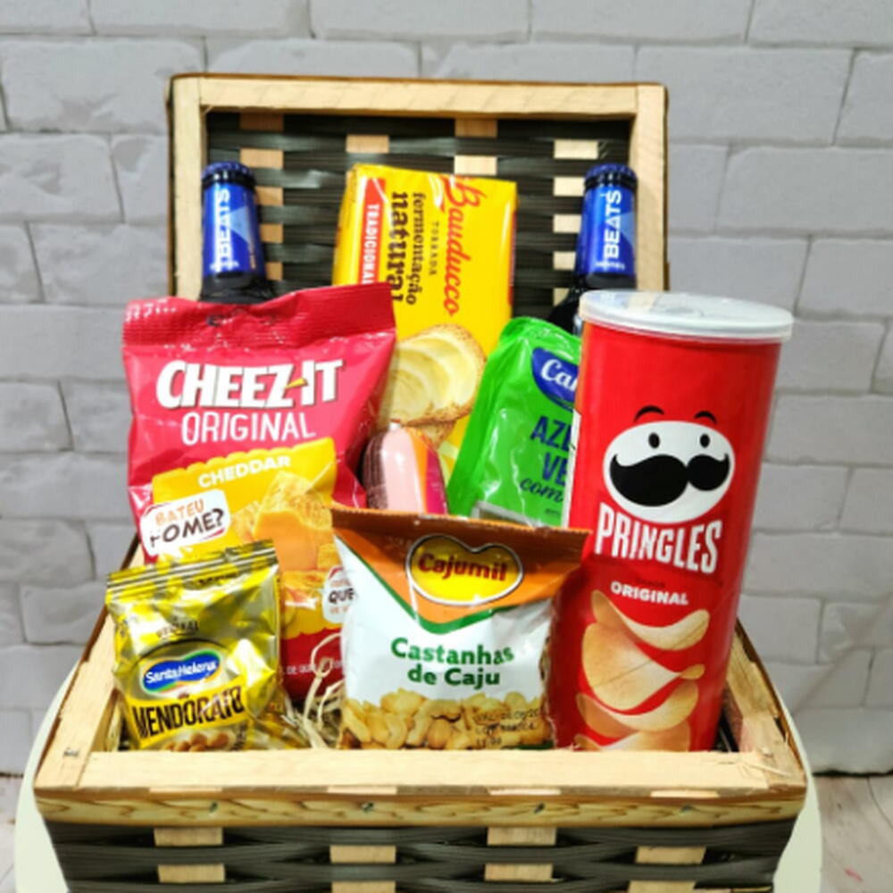 Este pacote de presente com bebida é perfeito para quem aprecia um bom lanche e uma bebida refrescante. Acompanha um delicioso pacote de batatas Pringles, duas opções de petiscos para aperitivo: pacote de castanhas de caju e um de amendoim - todos para despertar seu paladar. Além disso, vem com um pacote de torradas e um saboroso pote de patê para dar um toque gourmet ao seu lanche. Para a bebida, temos duas opções para escolher: smlrn0ff lce ou skol beats. Para completar, adicionamos um pacote de salgadinho de trigo e um saquinho de azeitonas. Este pacote é uma combinação perfeita de sabores e texturas, ideal para qualquer ocasião.