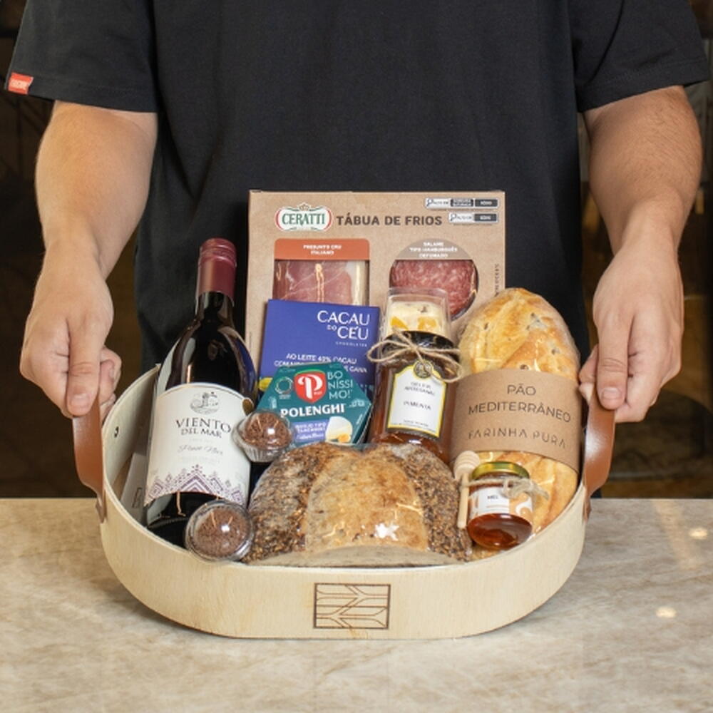 mel - 1 un. geleia de pimenta - 1 un. brigadeiro belga - 2 un. pão mediterrâneo farinha pura - 1 un. pão levain farinha pura - 1 un. pasta de brie com damasco - 1 un. vinho pinot noir viento del mar - 750 ml tábuas de frio ceratti - 1 un. chocolate cacau de céu nibs - 1 un. queijo camembert polenghi - 1 un.