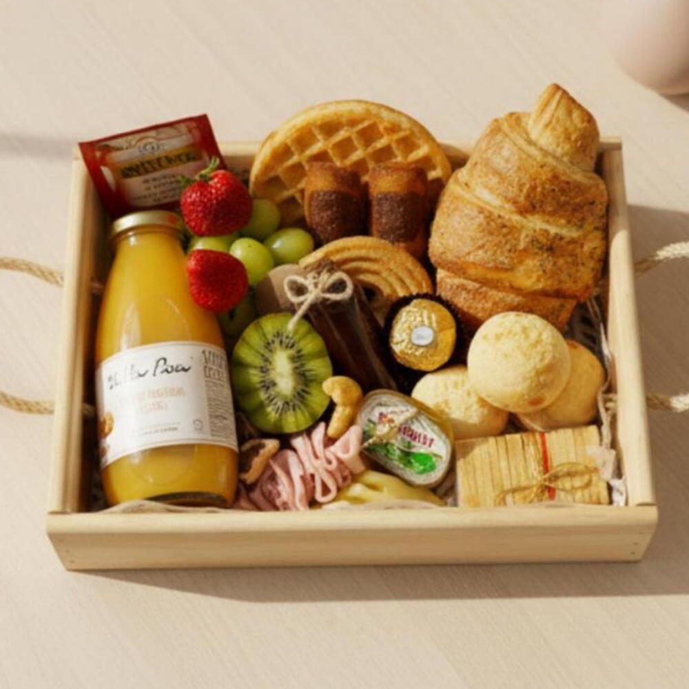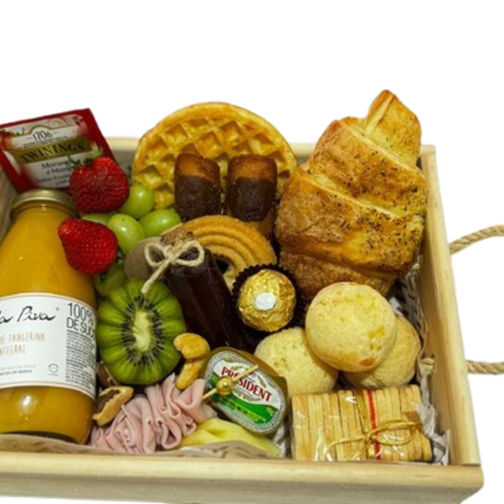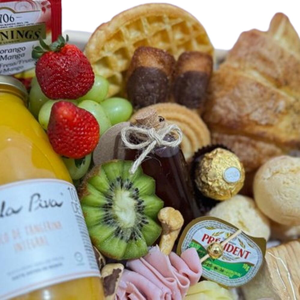 Croissant, Pãezinhos Selecionados, Pães de Queijo Recheados, Waffle ou Stroopwafel, Seleção de Biscoitos, Geleia, Mel, Manteiga, 1 Queijo, 1 Charcutaria, Torradas, Frutas Frescas, Castanhas em barra, Chocolate, Chá inglês Twinings, Suco Integral 300ml! *Obs: Itens sujeitos à substituição por equivalentes de mesmo valor ou superior.