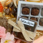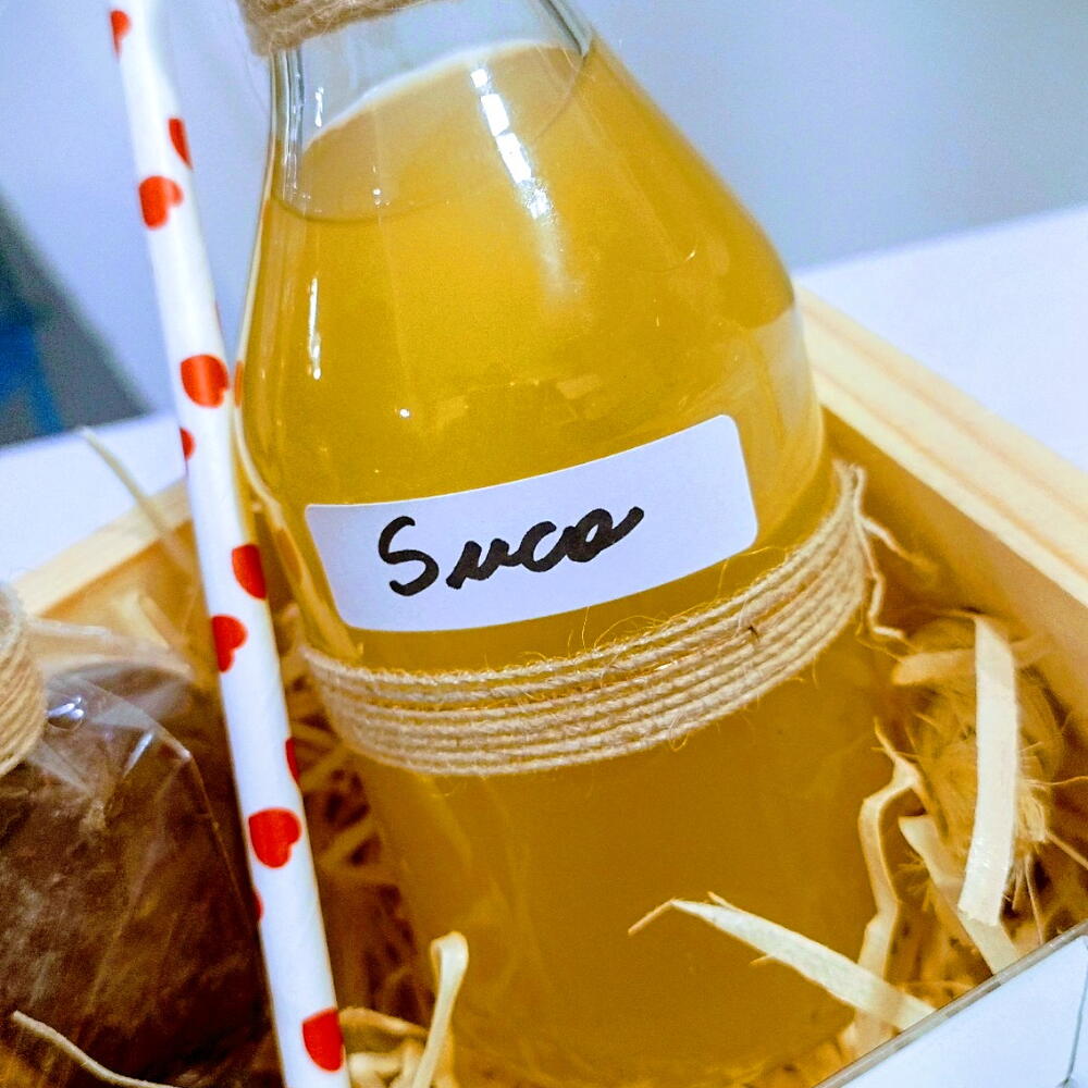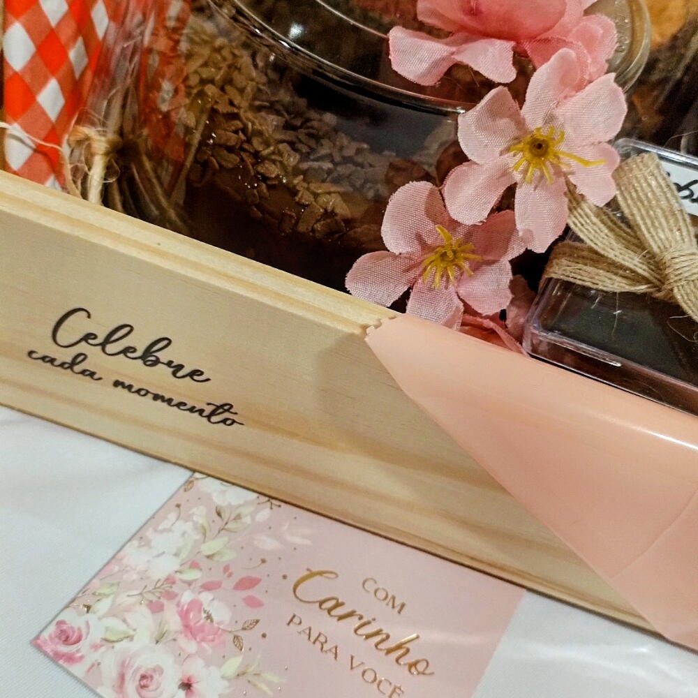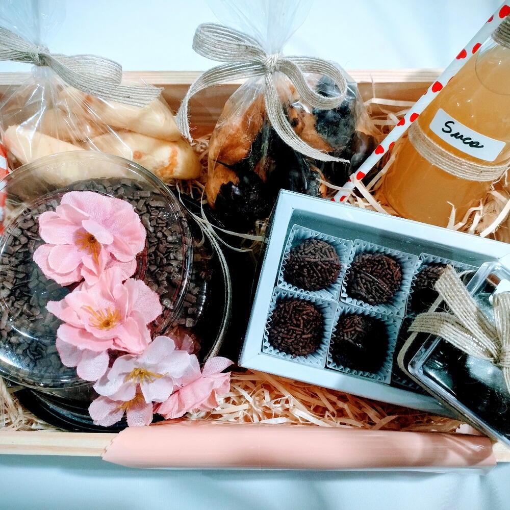 brigadeiros tradicionais - 6 un. canudo de papel - 1 un. doce carolinas recheadas - 6 un. garrafa de suco de laranja - 1 un. kit de faca e colher descartável - 1 un. mini pães de queijo ou chipa - 6 un. mini bolo redondo (sabor disponível no dia) - 1 un. cobertura no pote de ganache de chocolate - 1 un. decoração de flores artificiais - 1 un. caixa de mdf ou madeira (podendo ter variação de tons) - 1 un.