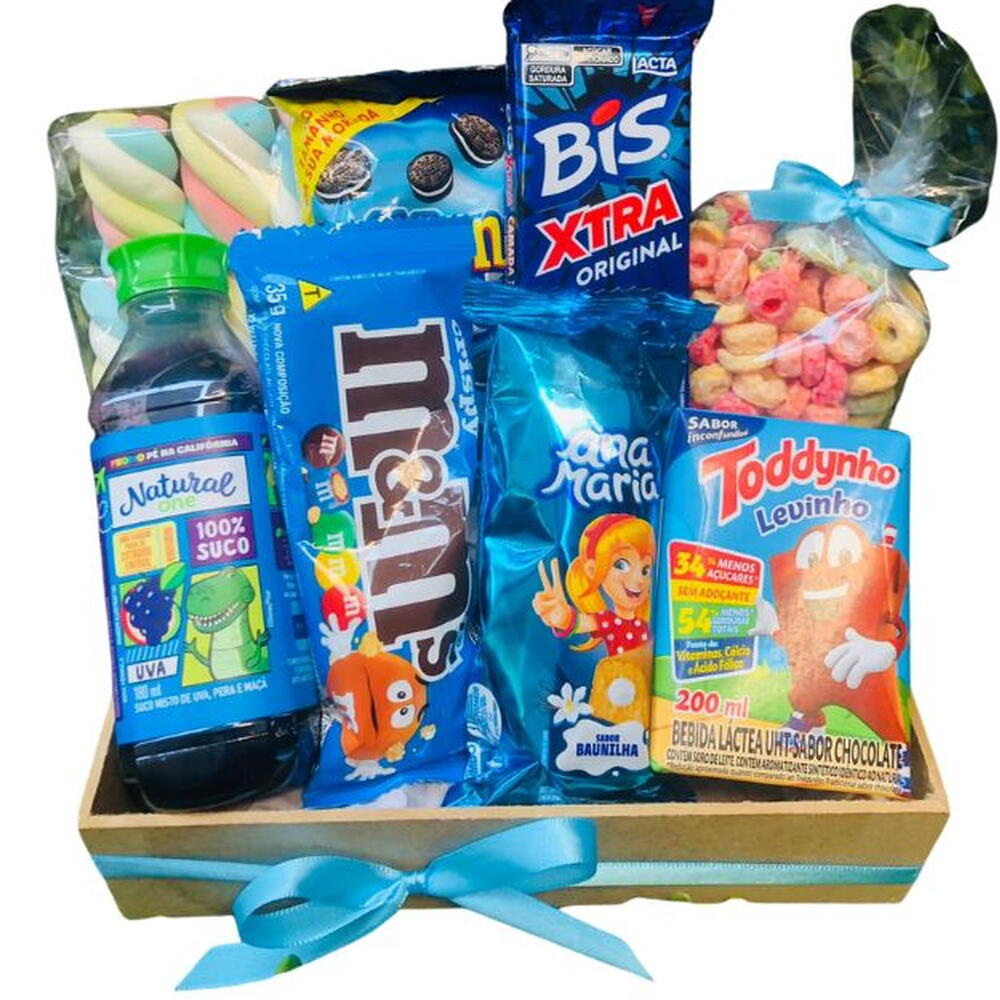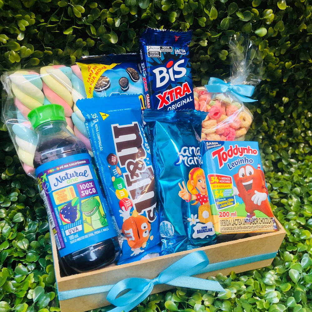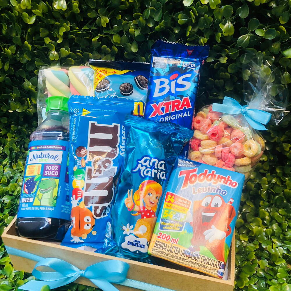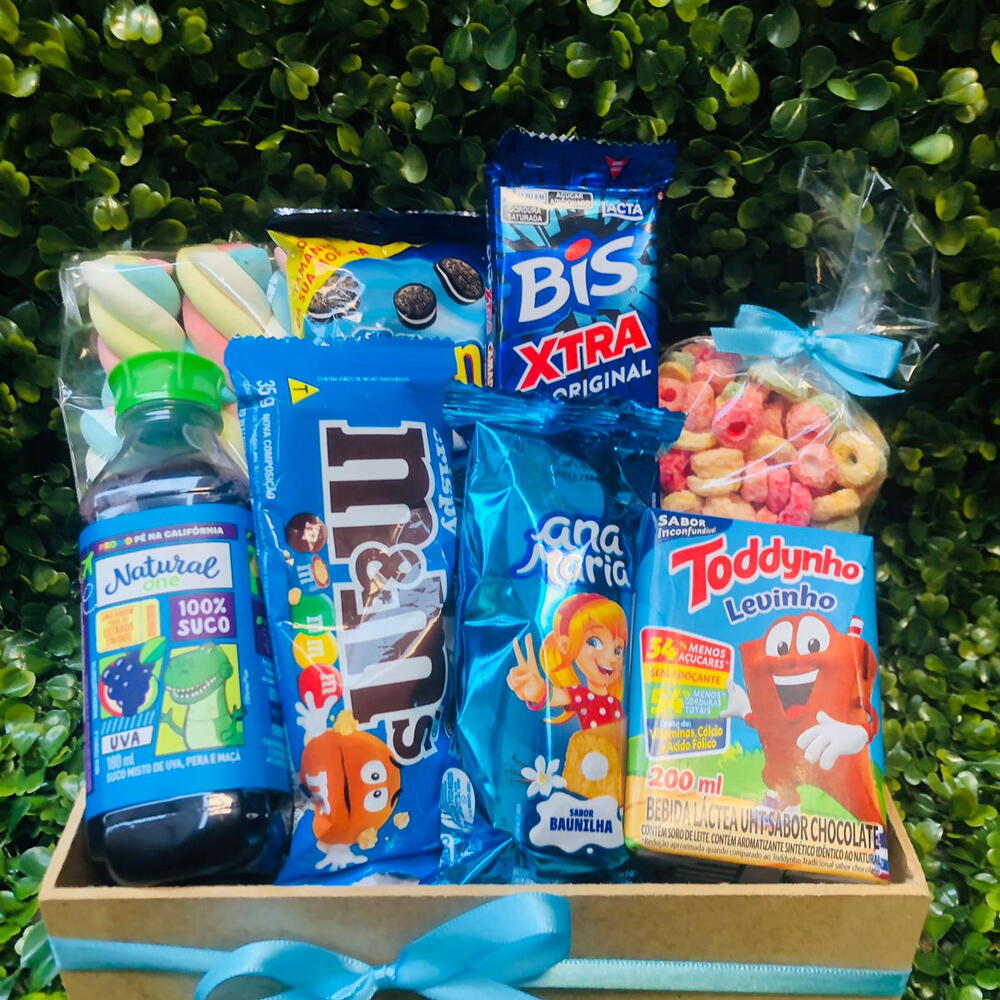 todynho - 1 un. bis extra - 1 un. pacote de mini oreo - 1 un. caixa em mdf decorada com laço de fita - 1 un. porção de marshmellow - 1 un. porção de sucrilhos coloridos - 1 un. bolinho ana maria individual - 1 un. pacote de mm´s - 1 un. suco de uva integral 200 ml - 1 un.