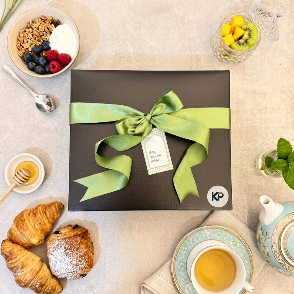 mini suco de laranja - 1 un. chá premium em sachê - 1 un. macarons franceses (caixa com 4 unidades) - 1 un. cappuccino gourmet (2 sachês) - 1 un. mini pães artesanais (2 unidades) - 1 un. mel terapêutico de laranja doce com óleos essenciais - 1 un. bombons de chocolate lindt (2 unidades) - 1 un.