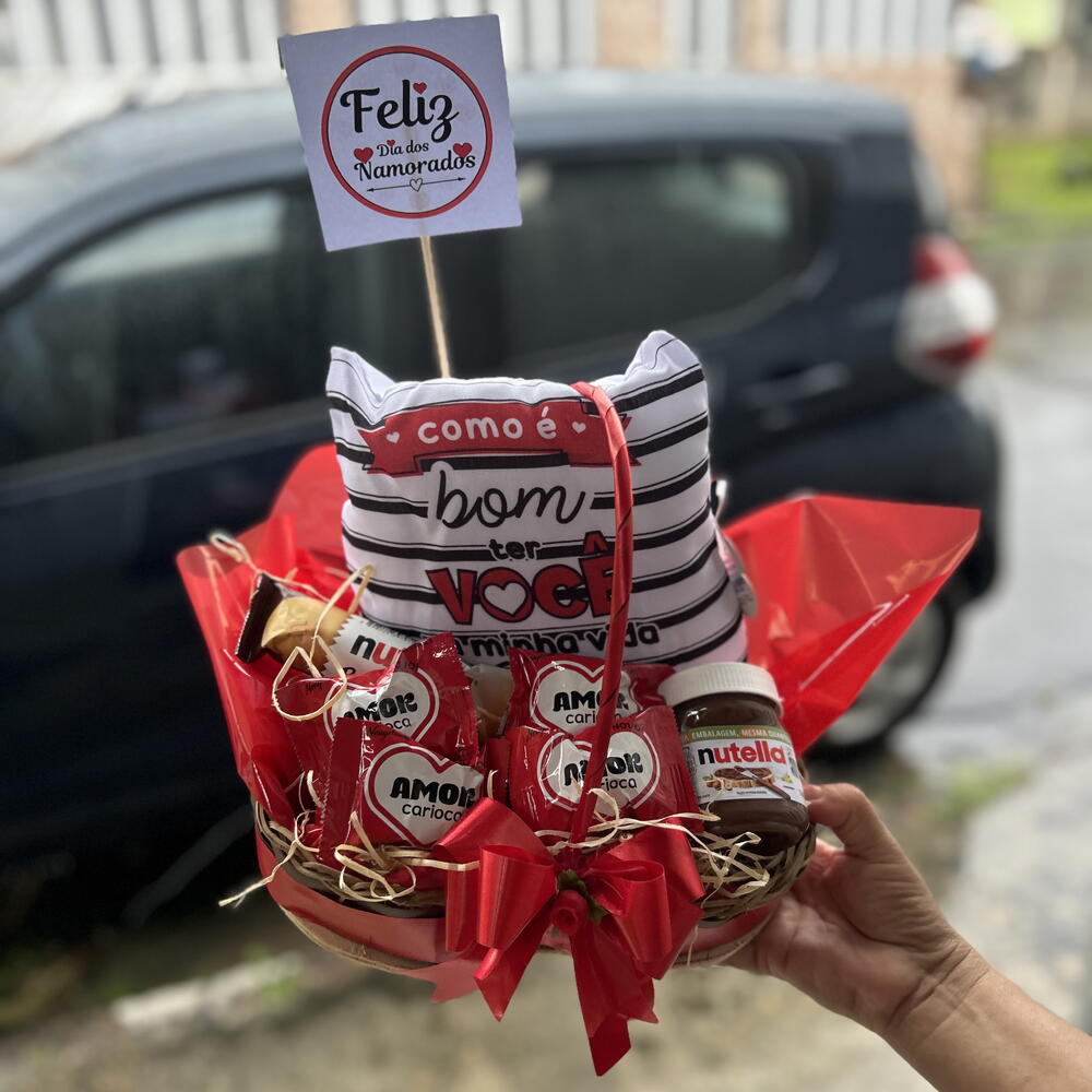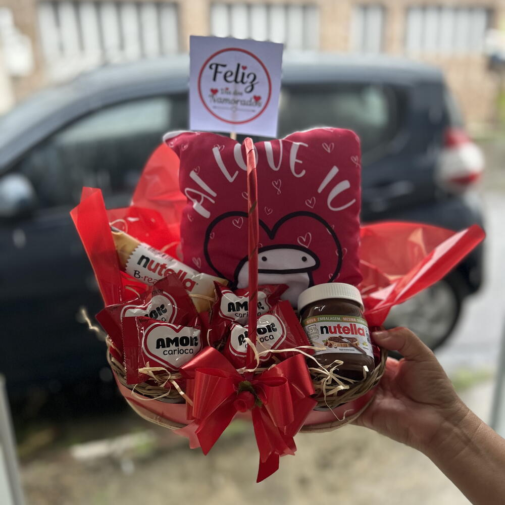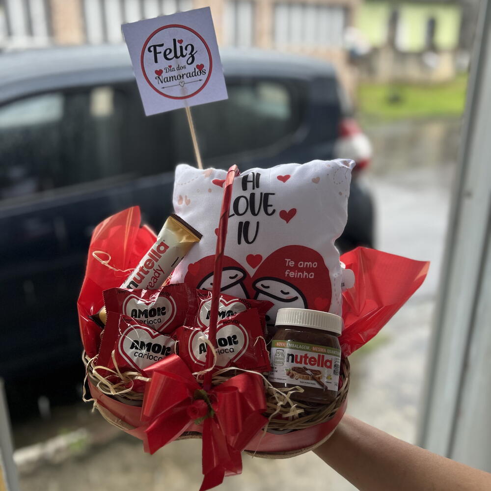barra de nutella - 1 un. almofada personalizada - 1 un. cesta decorada com laço - 1 un. nutella mini - 1 un. chocolates do - 5 un.