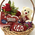 bombons sonho de valsa - 5 un. kitkat - 2 un. caixa de chocolates - 1 un. pelúcia ursinho - 1 un. arranjo com 2 rosa vermelhas - 1 un.