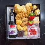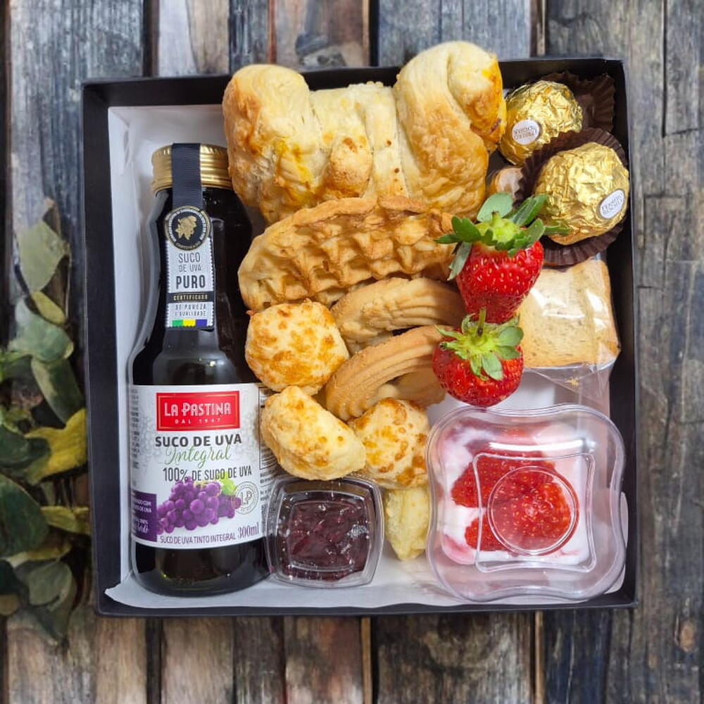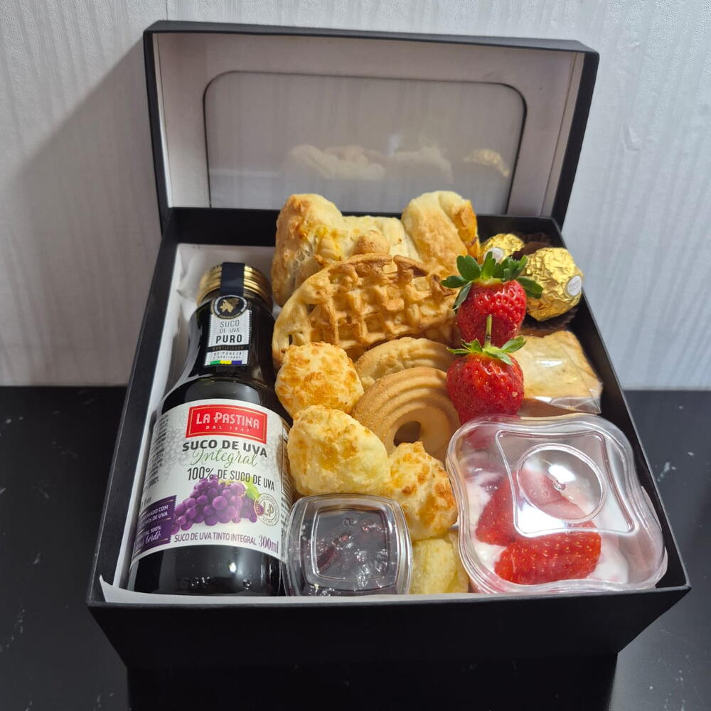 croissant - 1 un. geleia - 1 un. bombom - 2 un. iogurte grego - 1 un. pães de queijo - 5 un. waffle - 1 un. suco integral - 1 un. bolachinha de baunilha - 2 un. torrada slim crocante - 10 un. fruta da época (porção) - 1 un.