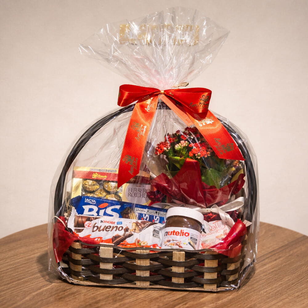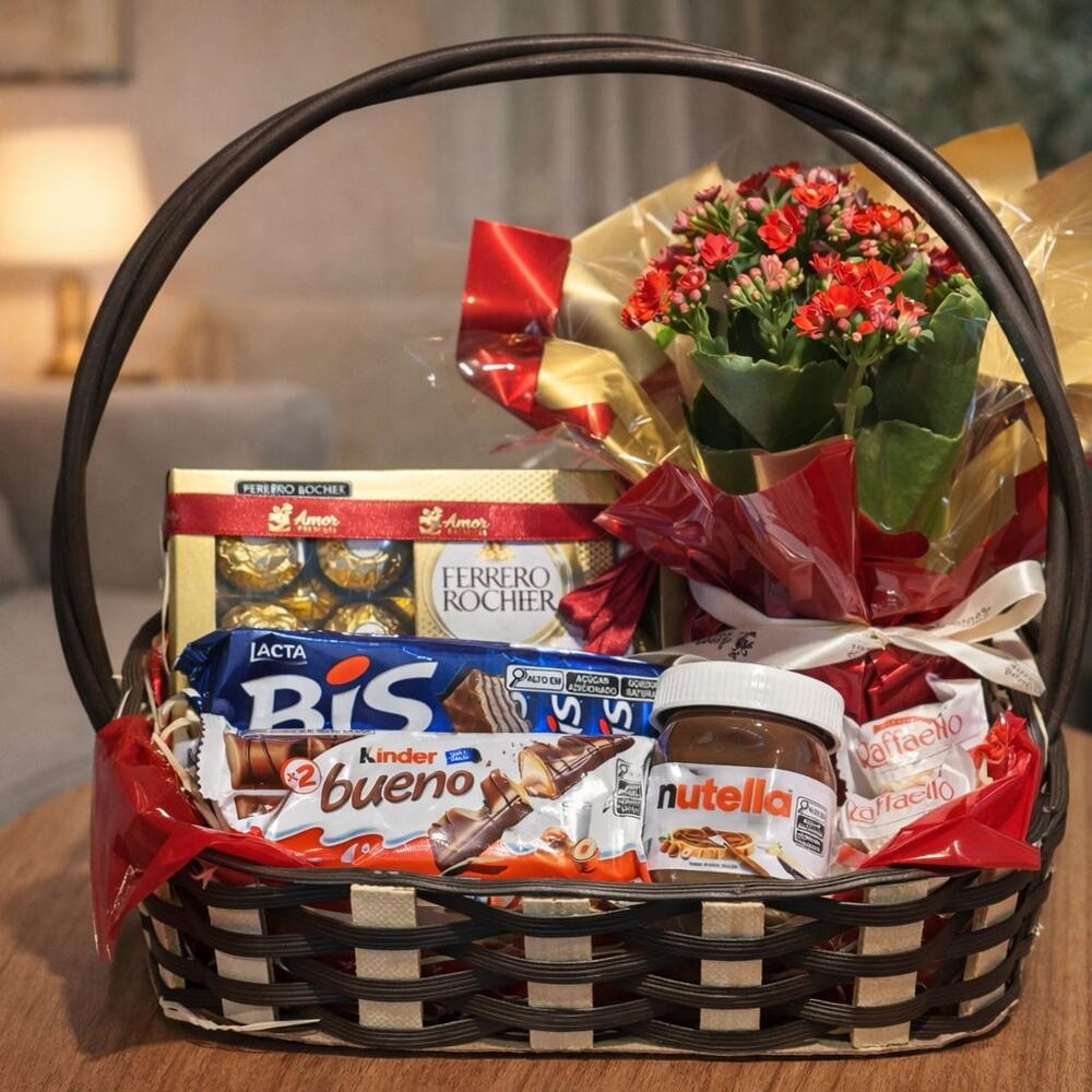 A Cesta Doce Encanto combina chocolates amados como Ferrero Rocher, Nutella, Kinder Bueno e Bis com a delicadeza de um kalanchoe natural. Um presente elegante, equilibrado e cheio de carinho, pronto para surpreender em aniversários, agradecimentos ou gestos de afeto inesperados.