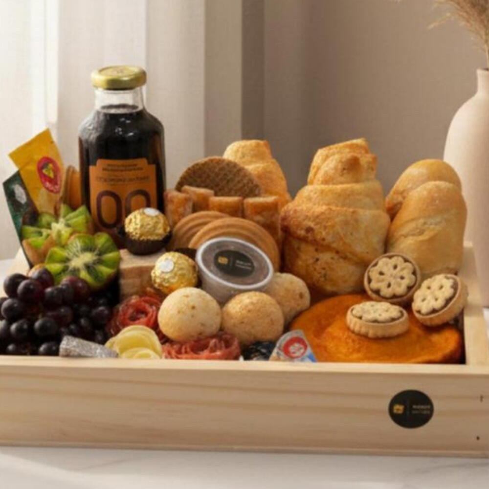 Croissants, Pães Selecionados, Pães de Queijo Recheados, Seleção de Biscoitos Finos, Mini Bolo Caseiro, Waflle ou Stroopwafel,Geleia, Doce de Leite, Mel, Manteiga, Requeijão Cremoso, 1 Queijo, 1 Queijo Polenguinho, 1Charcutaria, Torradas, Chocolate, Frutas Frescas, Castanhas em barra, Chá inglês Twinings, Suco Integral 300ml, Café Drip Coffee. *Obs: Itens sujeitos à substituição por equivalentes de mesmo valor ou superior.