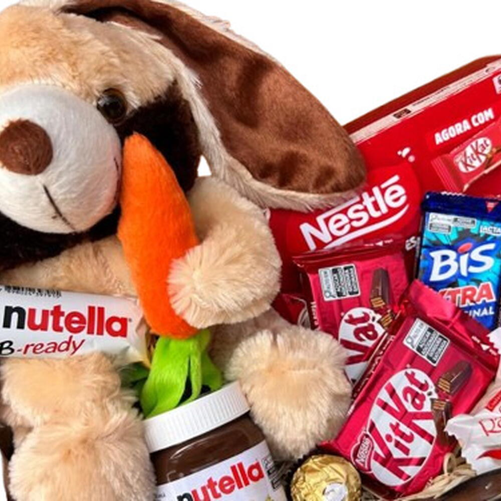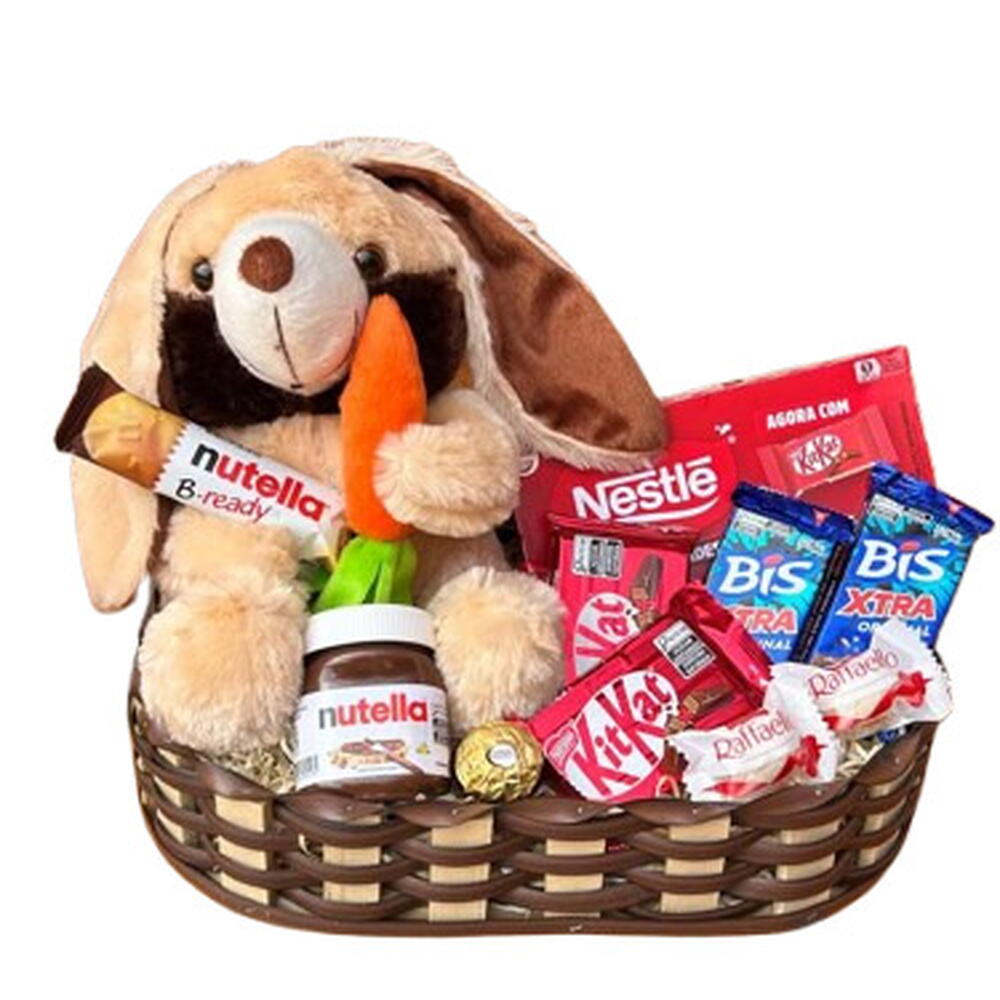 nutella b-ready - 1 un. bombom ferrero rocher - 1 un. chocolate kitkat - 1 un. bombom raffaello - 2 un. coelho de pelúcia segurando cenoura - 1 un. nutella pote pequeno - 1 un. caixa de chocolates sortidos nestlé - 1 un. barras bis - 2 un. cesta decorativa em vime - 1 un. embalagem pronta para presente - 1 un.