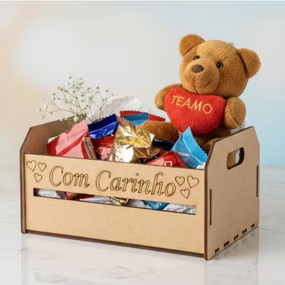 embalagem - 1 un. chocolates - 12 un. laço - 1 un. caixa mdf - 1 un. ursinho de pelúcia com coração “te amo” - 1 un.
