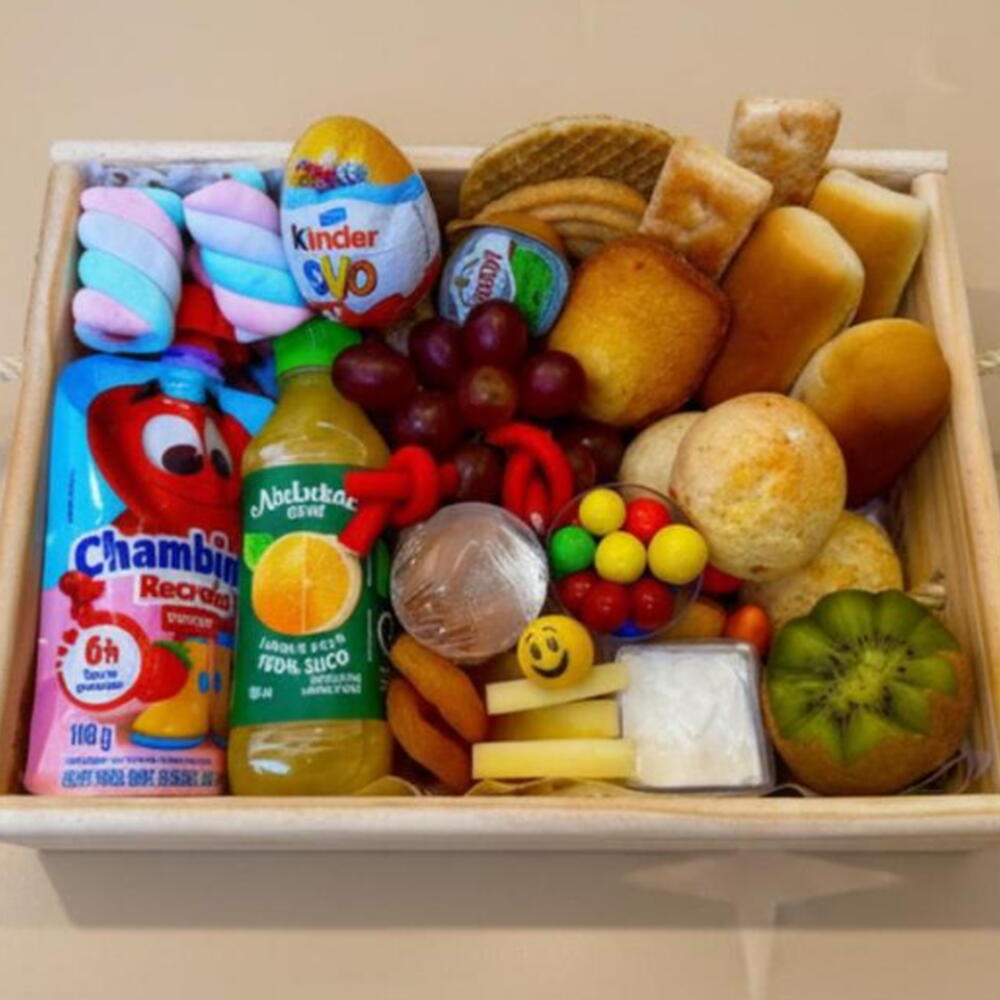 Inclui: Bisnaguinha ou Mini Croissants, Waffle, Madeleine Francesa, Pães de Queijo Recheados, Manteiga, Bolachinhas Importadas, Doce de Leite, Confeitos MMs, Kinder Ovo, Marsmallows, Frutas da estação, 1 Queijo, Suco Integral Laranja 180ml, logurte Pouch, Balas mastigáveis, Bala Fini. *Obs: Itens sujeitos à substituição por equivalentes de mesmo valor ou superior.