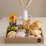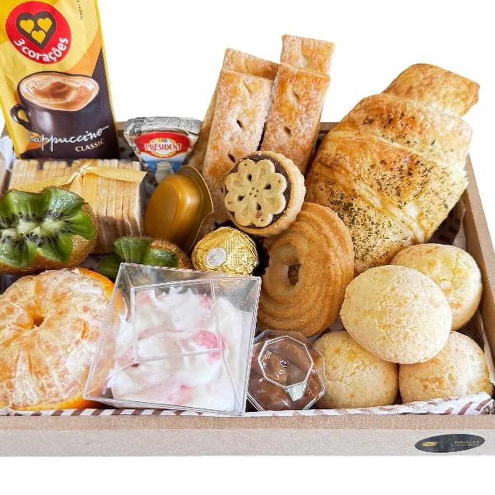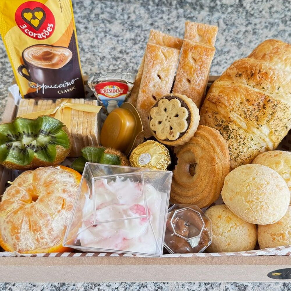 Croissant, Pães de queijo recheado, Biscoitos, Torradas, Doce de Leite ou Geleia, Manteiga ou Requeijão cremoso, Queijo Polenguinho, Frutas Frescas, Iogurte grego, Chocolate, Capuccino sachê ou chá Twinings. *Obs: Itens sujeitos à substituição por equivalentes de mesmo valor ou superior.