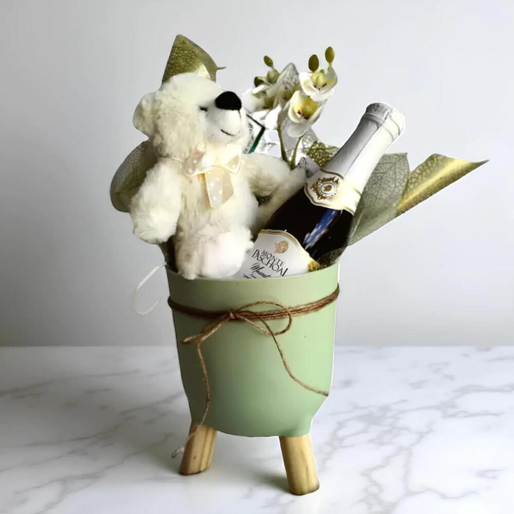 Surpreenda alguém especial com este pacote elegante e sofisticado de romantismo! Ele contém um urso de pelúcia suave e adorável pronto para abraçar a pessoa amada. Acompanhando este adorável urso está uma garrafa de Vinho Moscatel Espumante Branco 187ml, perfeito para brindar ocasiões especiais. Mas o romance não para por aí, um mini buquê de orquídia artificial adiciona uma pitada de beleza e elegância. Para completar o mimo, ele também inclui um cachepot de acrílico com pernas de madeira, que pode ser usado de diversas formas, adicionando um toque de charme a qualquer espaço.