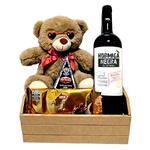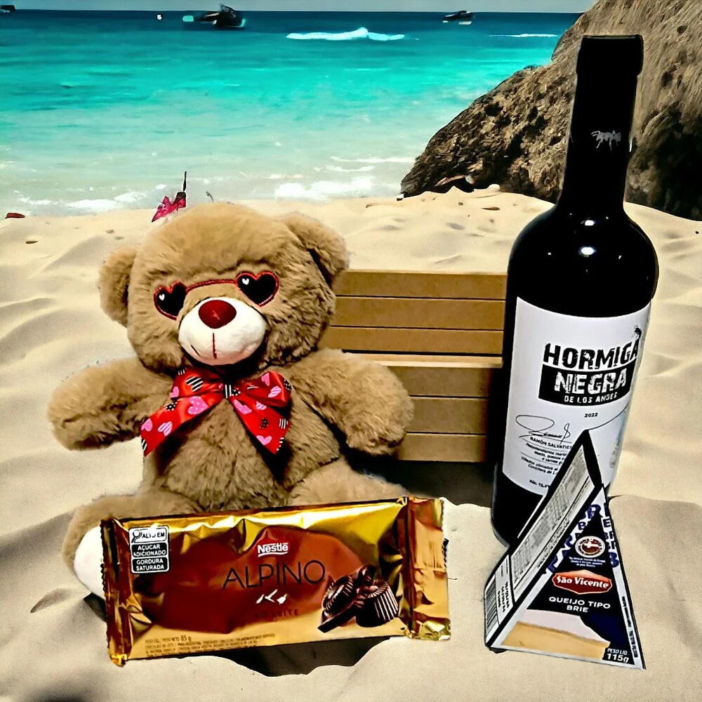 urso de pelúcia - 1 un. caixa baú mdf - 1 un. celofane + laço - 1 un. queijo brie 115 g - 1 un. vinho fino tinto seco argentino hormiga negra malbec 750 ml - 1 un. chocolate alpino ao leite 85 g - 1 un.