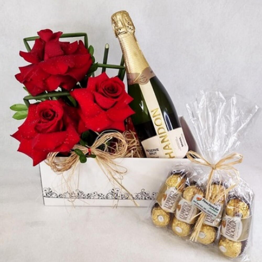 Este presente elegante é composto por três rosas belas e frescas, escolhidas cuidadosamente pelos nossos floristas para transmitir uma mensagem de carinho e apreço. Além das flores, a caixa contém um bombom Ferrero Rocher, fazendo deste um presente irresistível para o paladar. Para completar a experiência de sabores, acompanha ainda um espumante Salton Moscatel Clássico, reconhecido pela sua qualidade e requinte. Esta combinação harmoniosa transforma este presente em uma escolha perfeita para comemorações especiais ou simplesmente para surpreender alguém querido de forma marcante.