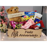 Cesta Feliz Aniversario "Flork" com Chocolates e Mini Urso Chaveiro "Parabens"