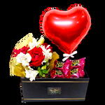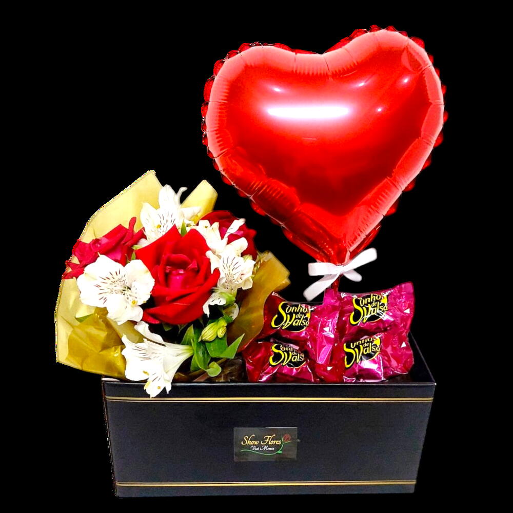 laço de cetim - 1 un. embalagem celofane - 1 un. lindo arranjo de flores naturais - 1 un. caixa de presente - 1 un. lindo balão - 1 un. bombons sonho de valsa ou ouro branco ( o que estiver disponível no momento ) - 4 un.