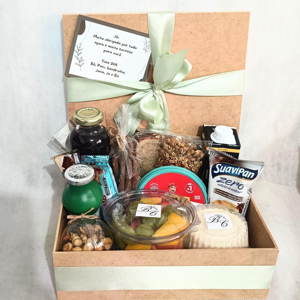 iogurte - 1 un. barrinha de cereal - 1 un. granola - 1 un. queijo branco - 1 un. yopro - 1 un. mix de castanhas - 1 un. pão integral - 1 un. suco integral de uva - 1 un. mix de frutas - 1 un. bolinho diet - 1 un. cartão de mensagem - 1 un. foto polaroid - 1 un. bolacha integral - 1 un. creme de ricota light - 1 un. torradas integral - 1 un.