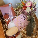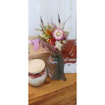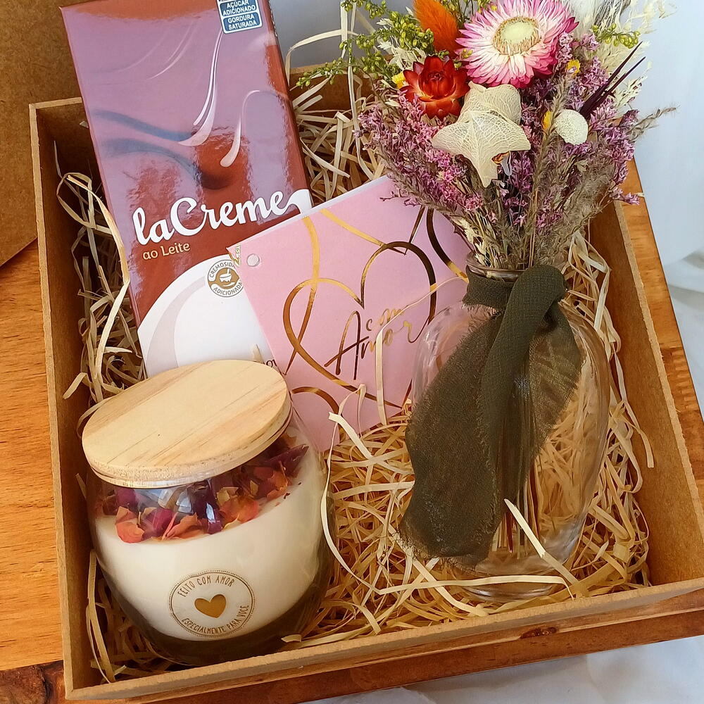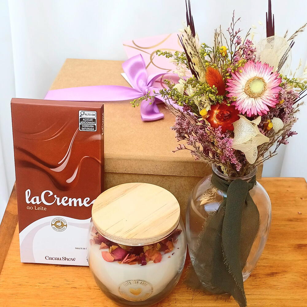 arranjo de flores desidratadas - 1 un. barra de chocolate cacau show 100g - 1 un. vaso transparente primor - 1 un. vela aromática artesanal rosa - 1 un. caixa mdf e finalização - 1 un.