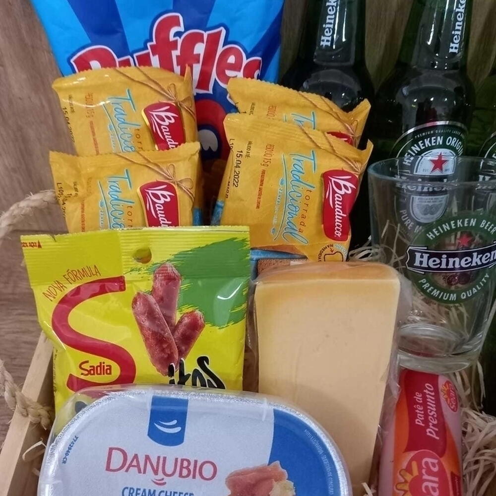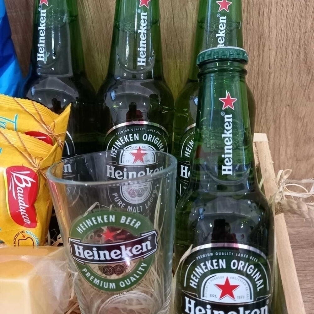 Este presente é um convite para um autêntico happy hour. Contém quatro cervejas Heineken Long Neck, que se destacam pela qualidade e sabor reconhecidos mundialmente. A experiência fica ainda mais completa com um copo de vidro da marca Heineken. Para acompanhar, uma seleção de petiscos: uma porção de azeitonas, queijo provolone, um pacote de batatas Elma Chips, patê, salamitos e um cremoso queijo. Este conjunto é perfeito para quem valoriza bons momentos de relaxamento e descontração.