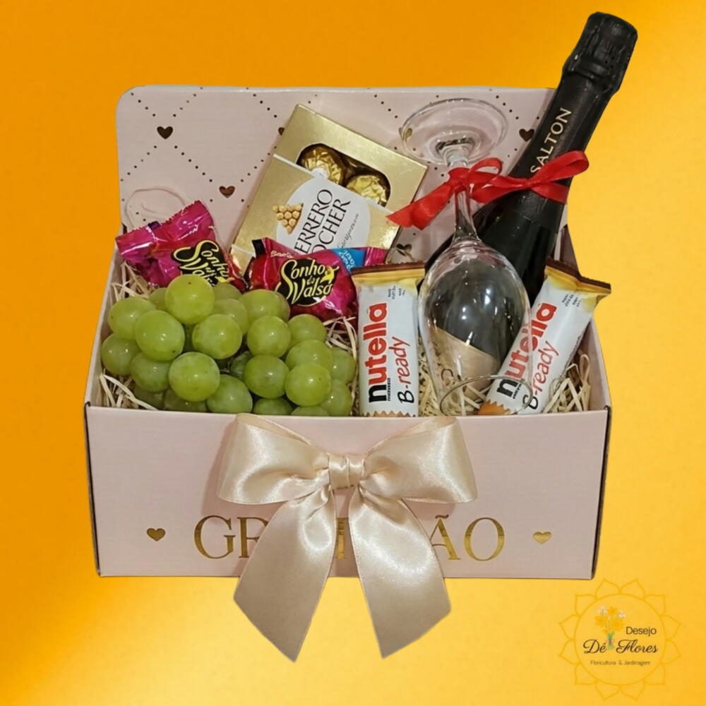 bombons sonho de valsa - 5 un. nutella b-ready - 2 un. uvas verdes - 1 un. ferrero rocher 8un - 1 un. cartão de mensagem - 1 un. espumante salton - 1 un. laço natalino - 1 un. taça para espumante - 1 un. box tematico gratidão - 1 un. embalagem celofone transparente - 1 un.