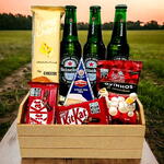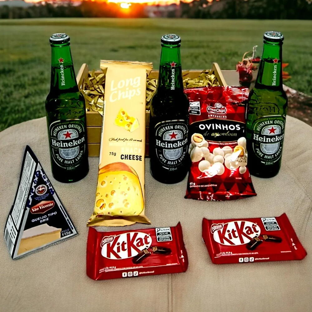 celofane e laço - 1 un. caixote em mdf - 1 un. cerveja long neck heineken 330 ml - 3 un. batata long chips 75 g - 1 un. queijo tipo brie 115 g - 1 un. ovinho de amendoim elma chips 65 g - 1 un. chocolate kit kat 41 g - 2 un.