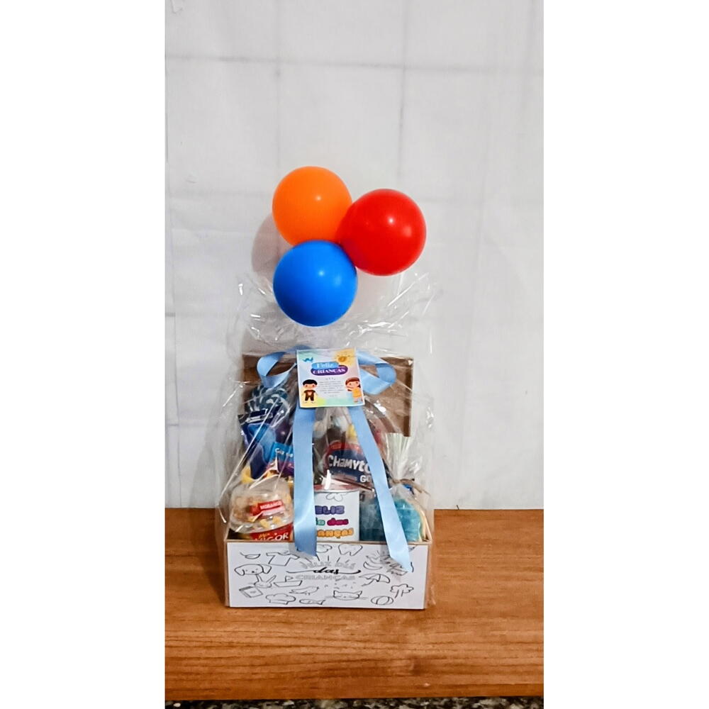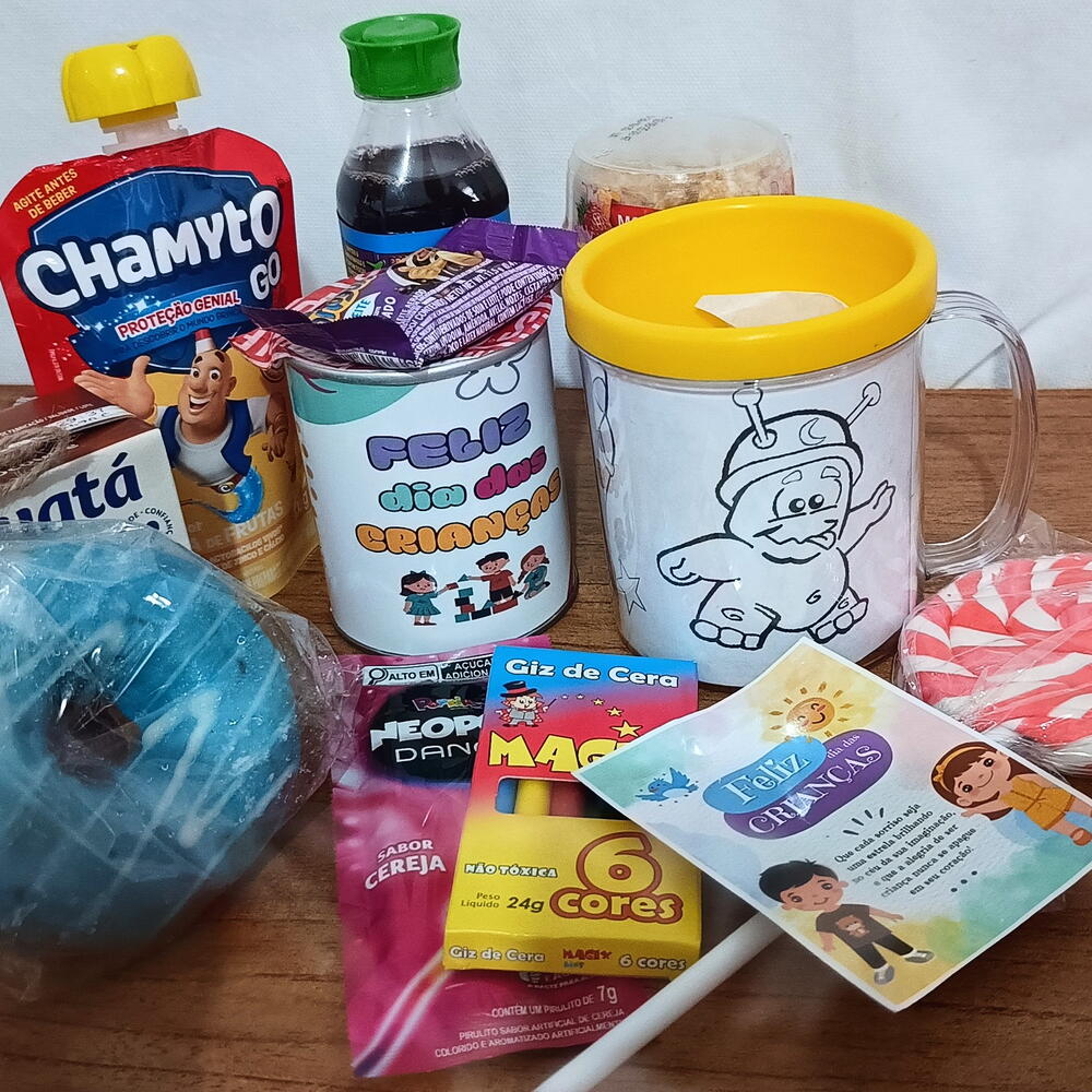pães de leite - 2 un. donuts - 1 un. bexigas coloridas - 3 un. embalagem celofane - 1 un. pirulito - 2 un. toddynho 200ml - 1 un. batata pote 40g - 1 un. chamyto - 1 un. suco natural one (laranja ou uva) - 1 un. cx mdf - 1 un. copo acrílico de pintar - 1 un. giz de cera 6un - 1 un. iogurte mix vigor - 1 un.