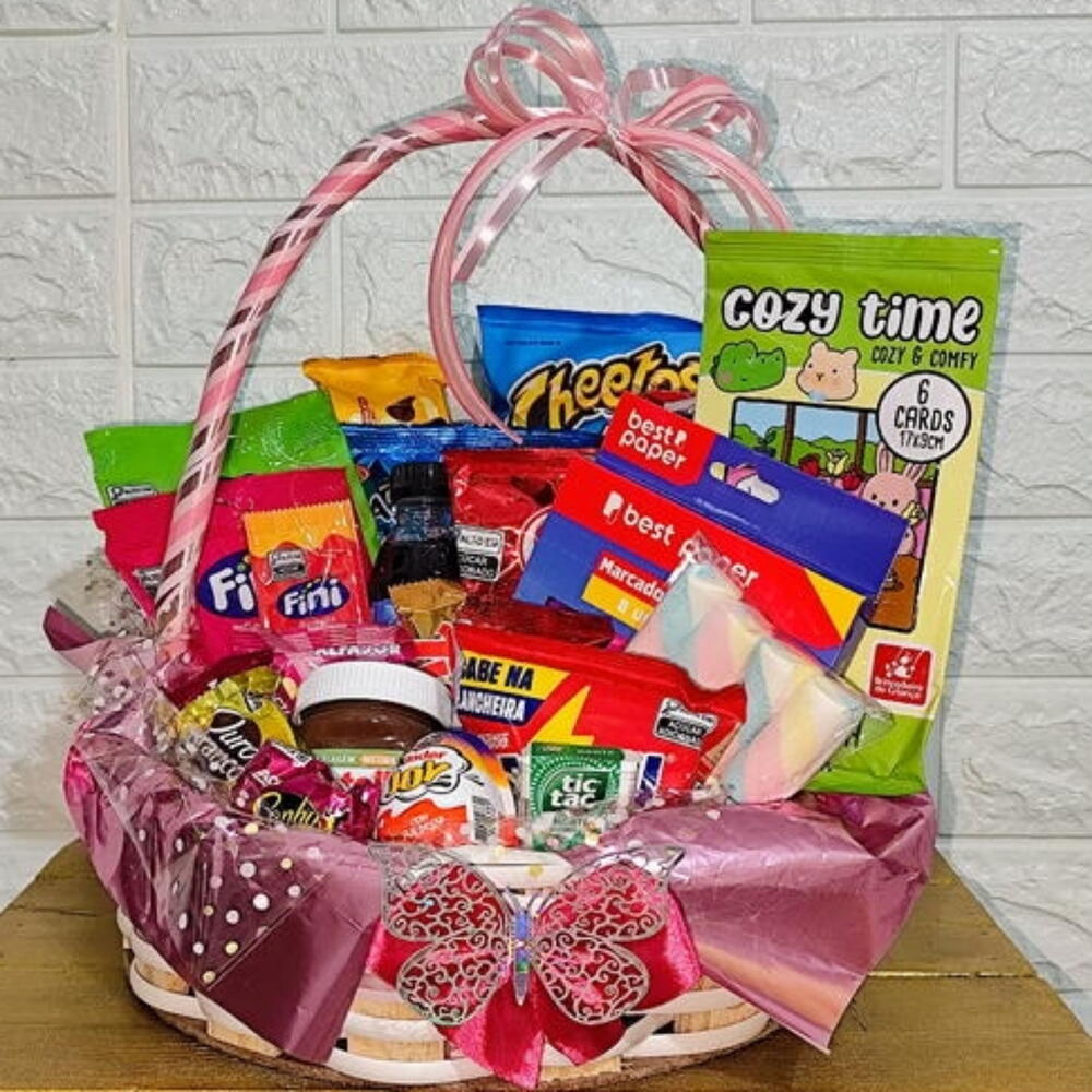 Cesta para presentear crianças e até mesmo aquela pessoa que adora um doce. Contem em torno de 20 itens. Sempre acrescentamos itens a mais como chocolates. Produtos de qualidade. A cestinha é decorada de acordo com perfil (menino ou menina). Nos envie por chat cores preferenciais para a montagem da mesma.