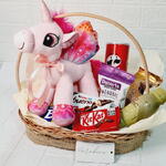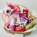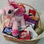 kinder bueno - 1 un. laço - 1 un. achocolatado - 1 un. embalagem celofane - 1 un. alpino - 1 un. pelúcia unicórnio - 1 un. cesta decorada com laço - 1 un. lata de batatas - 1 un. nutella 50 g - 1 un. chocolate bis. kit kat - 1 un.