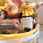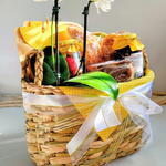 manteiga - 3 un. biscoitos amanteigados - 6 un. doce de leite - 1 un. pão de fermentação natural - 2 un. iogurtes - 2 un. orquídea (cor disponível do dia) - 1 un. salame ou lombo canadense - 8 un. laço em cetim - 1 un. queijo minas padrão - 4 un. tag em acrílico - 1 un. cesto em taboa - 1 un. stroopwafel holandês recheado de caramelo - 2 un. croissant folhados de manteiga - 2 un. pães de queijo artesanais - 6 un. brownie de chocolate artesanal - 1 un. mini tábua - 1 un. porção de mix de frutas - 1 un. bolo caseiro com cobertura - 1 un. suco de uva premium grande - 500 ml drip coffee (café para coar) ou chá inglês a escolha do cliente - 2 un.
