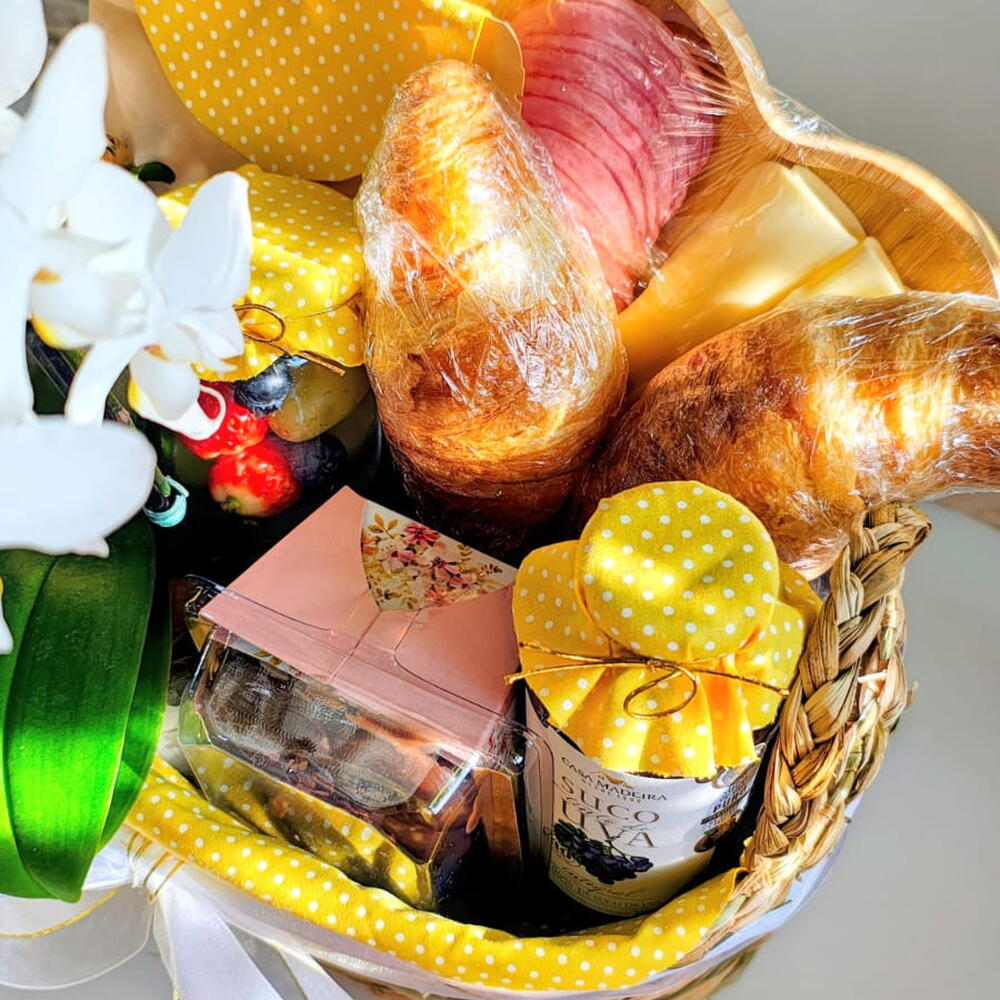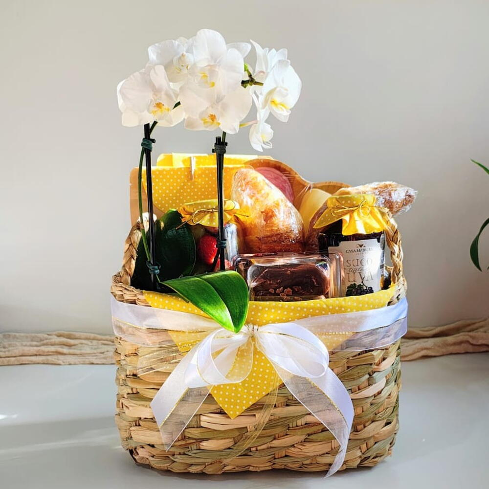 manteiga - 3 un. biscoitos amanteigados - 6 un. doce de leite - 1 un. pão de fermentação natural - 2 un. iogurtes - 2 un. orquídea (cor disponível do dia) - 1 un. salame ou lombo canadense - 8 un. laço em cetim - 1 un. queijo minas padrão - 4 un. tag em acrílico - 1 un. cesto em taboa - 1 un. stroopwafel holandês recheado de caramelo - 2 un. croissant folhados de manteiga - 2 un. pães de queijo artesanais - 6 un. brownie de chocolate artesanal - 1 un. mini tábua - 1 un. porção de mix de frutas - 1 un. bolo caseiro com cobertura - 1 un. suco de uva premium grande - 500 ml drip coffee (café para coar) ou chá inglês a escolha do cliente - 2 un.