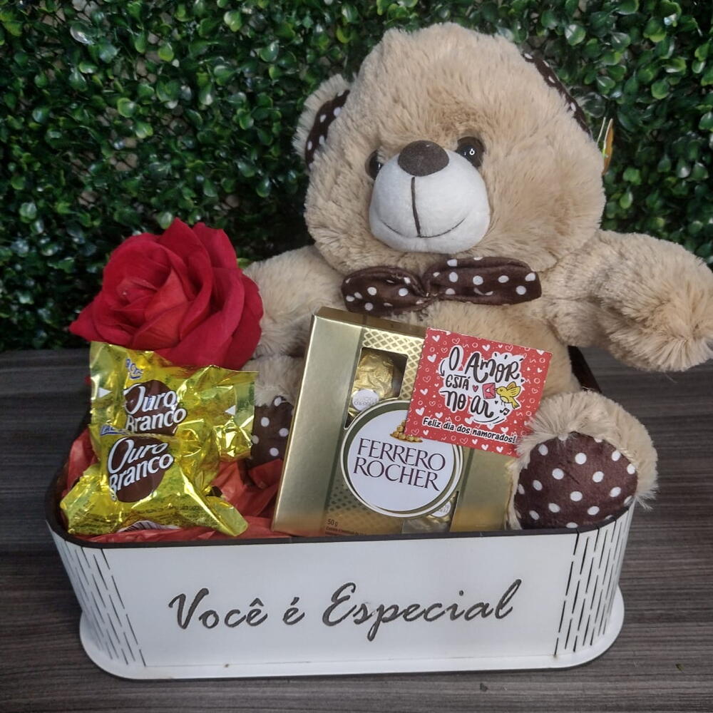 pelucia - 1 un. ouro branco 20g - 2 un. rosa artificiais - 1 un. cesta de mdf - 1 un. ferreros rocher 100gr - 1 un.