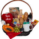 maçã - 1 un. sachê de chá - 1 un. polenguinho - 1 un. sachê de café solúvel - 1 un. sachê de capuccino - 1 un. bombom ferrero rocher - 3 un. mamão papaya - 1 un. sachê de açúcar - 2 un. salame italiano - 1 un. biscoito belvita - 1 un. sachê de adoçante - 2 un. croissant manteiga - 1 un. coração de pelúcia bordado - 1 un. pão fatiado - 2 un. caneca branca de porcelana - 1 un. manteiga mini - 1 un. queijo parmesão especial - 1 un. uva sem semente - 1 un. pão baguete parmesão - 1 un. geleia mini importada - 1 un. suco natural garrafinha - 1 un. frios ( queijo e presunto ) - 1 un.