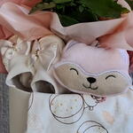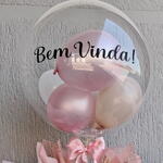 caixa box - 1 un. naninha para o bebê - 1 un. par de sapatinhos rn tecido - 1 un. flor natural calandiva ou kalanchoe - 1 un. balão bubble escrito bem vinda - 1 un.