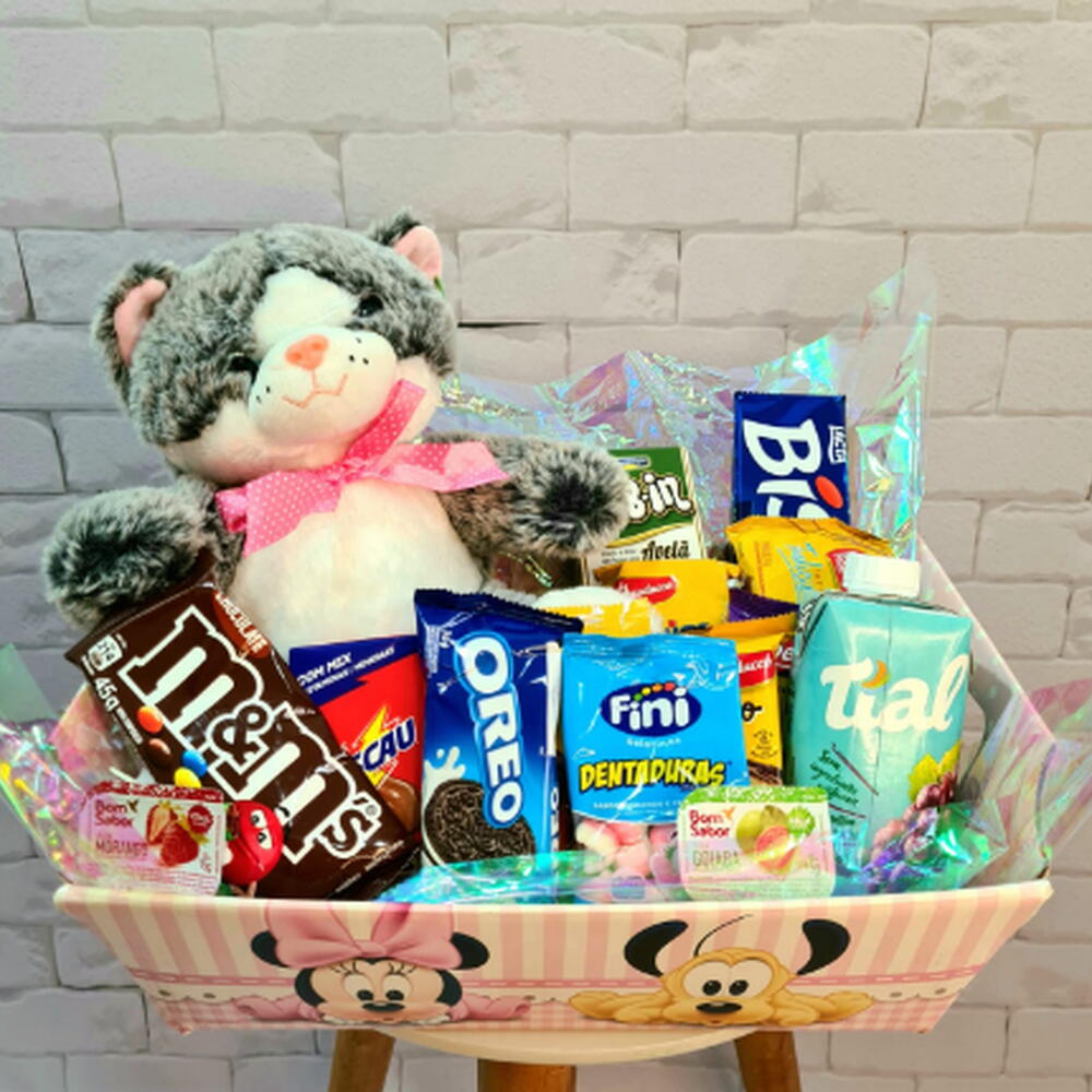 Mergulhe em um mundo de delícias com a nossa Cesta Infantil recheada de tesouros apetitosos! Ela contém uma variedade de gostosuras pensadas especialmente para as crianças: uma torrada Bauducco, duas unidades de geleia, um Polenguinho, uma barra de cereal, cookies Bauducco, um pão de mel Bauducco e um bolinho recheado Bauducco. Mas a diversão não para por ai, temos também um biscoito wafer, um chocolate MM, um achocolatado Toddynho de 200 ml, um suco Del Valle de 200 ml, uma caixa de chocolates Bis, uma balinha de gelatina em formato de dentaduras, uma bolacha recheada Oreo e uma bolacha água e sal da marca Pit Stop. É um verdadeiro festival de sabores que promete alegrias a cada mordida!