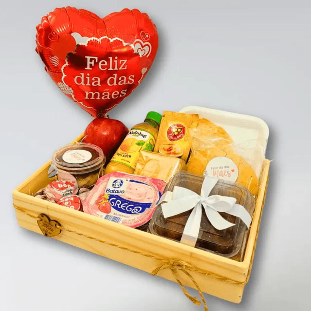 fruta - 1 un. suco - 1 un. bombons - 2 un. iogurte grego - 1 un. sachê de cappuccino - 1 un. pão de batata - 1 un. porção de cookies - 1 un. bolo no pote - 1 un. croissant g - 1 un. saco transparente e laço para embrulho. - 1 un. balão de coração com frase - 1 un. bandeja de madeira pinus com tag melhor mãe do mundo - 1 un.
