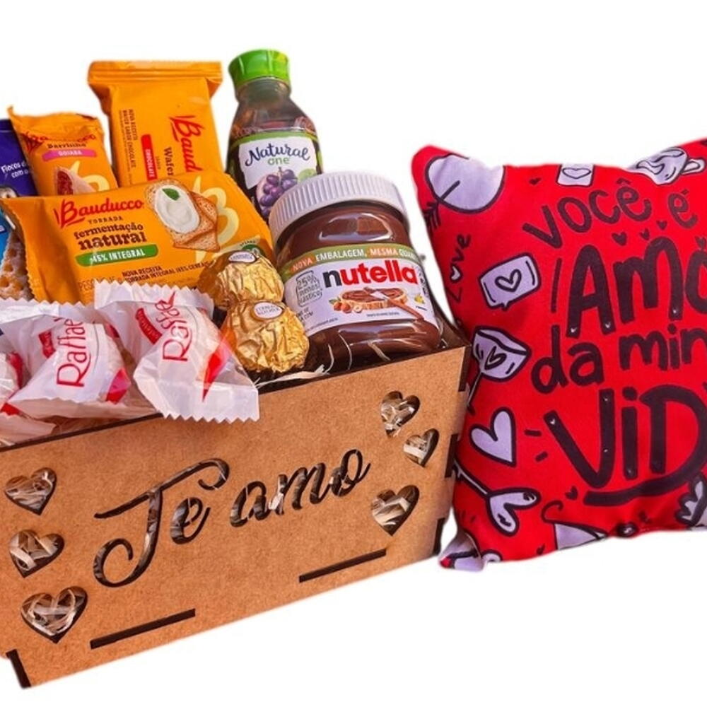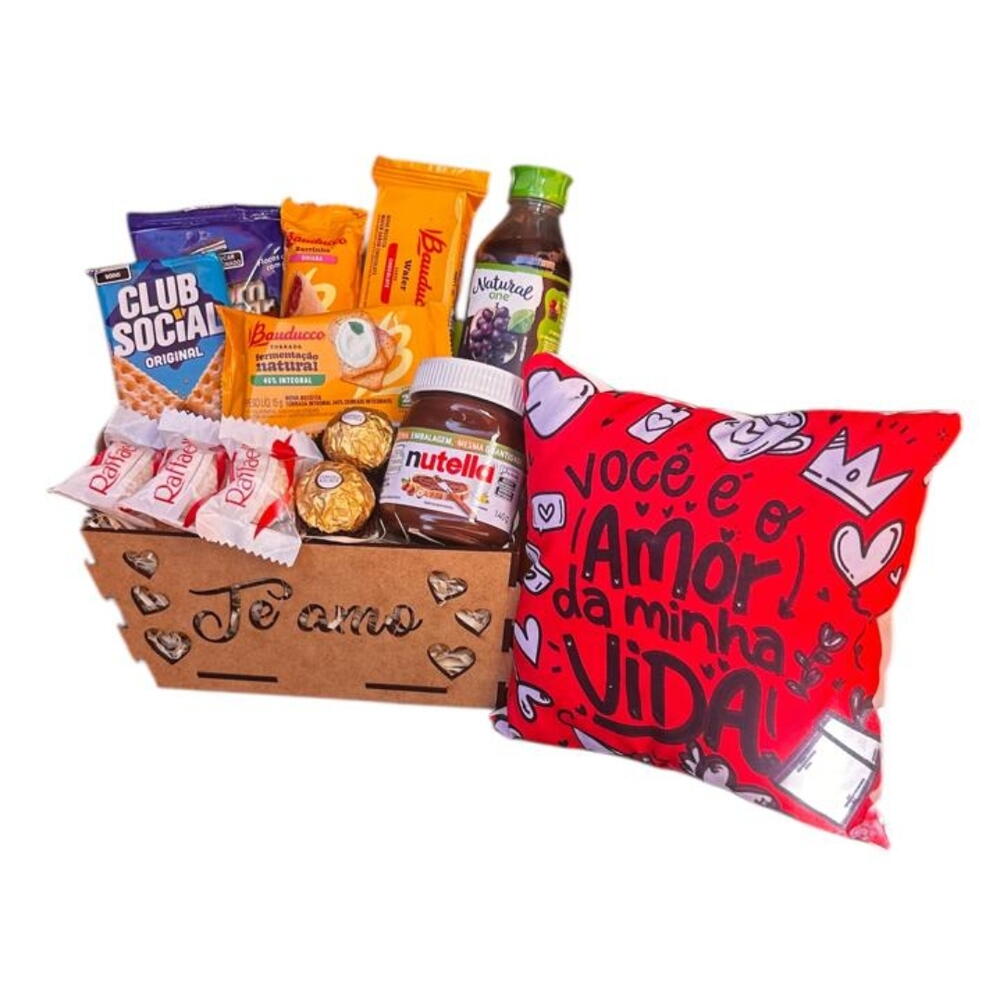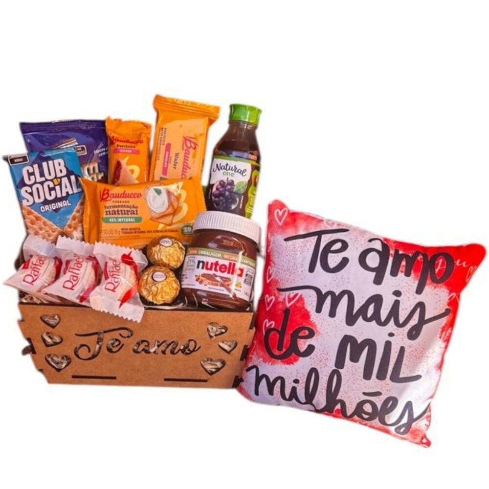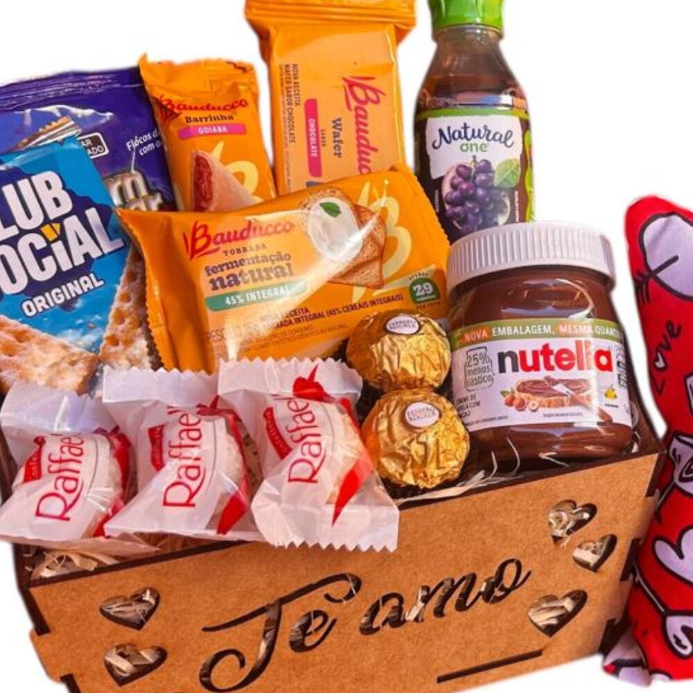bombons ferrero rocher - 2 un. torrada bauducco - 1 un. laço - 1 un. sucrilhos - 1 un. goiabinha bauducco - 1 un. nutella 140g - 1 un. biscoito club social - 1 un. suco natural de uva - 1 un. bombons raffaello - 3 un. wafer bauducco - 1 un. almofada romântica - 1 un. celofane embalagem - 1 un. cesta em mdf decorada - 1 un.