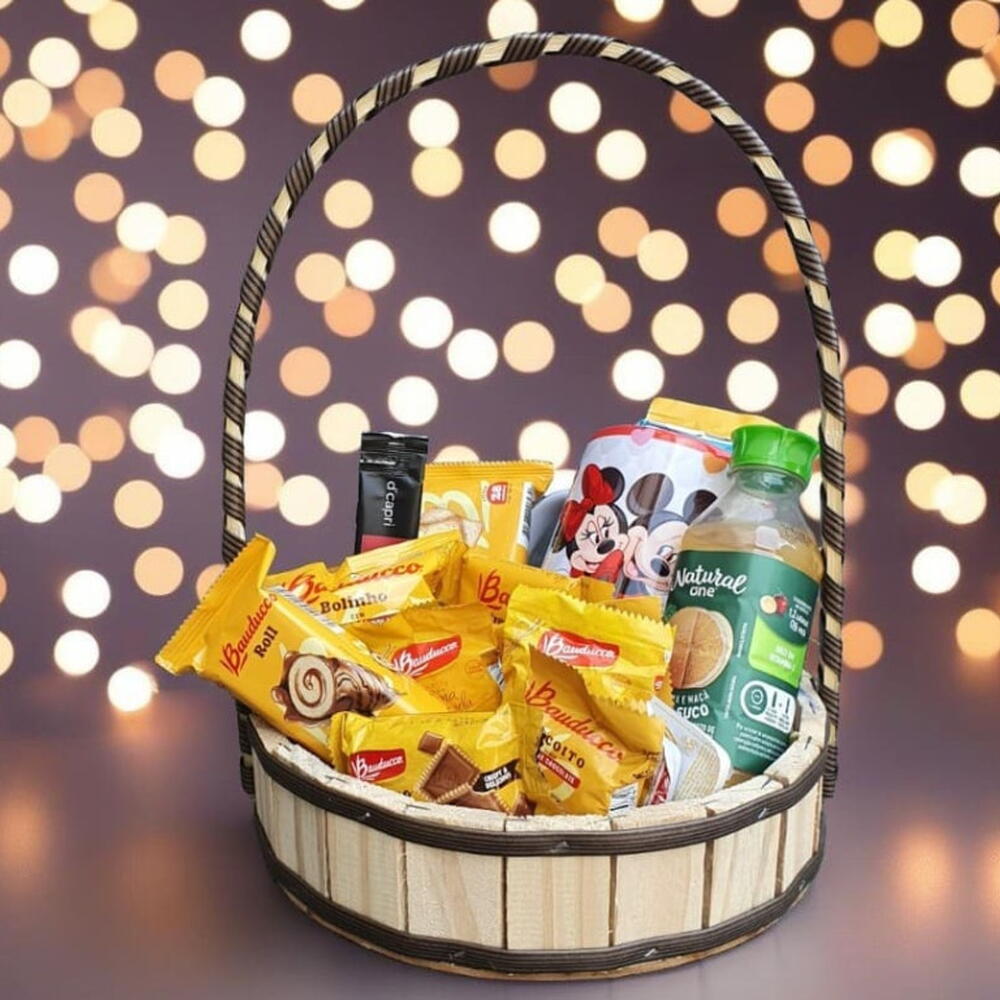 bolinho bauducco - 1 un. torrada bauducco - 1 un. cesta - 1 un. laço - 1 un. capuccino sachê - 1 un. adoçante sachê - 1 un. embalagem celofane - 1 un. açucar sachê - 1 un. café solúvel sachê - 1 un. choco biscuit - 1 un. geleia sachê - 1 un. roll bauducco - 1 un. biscoitos sortidos bauducco - 5 un. suco natural one 180 ml - 1 un. caneca personalizada mickey e minnie - eu e você - 1 un.