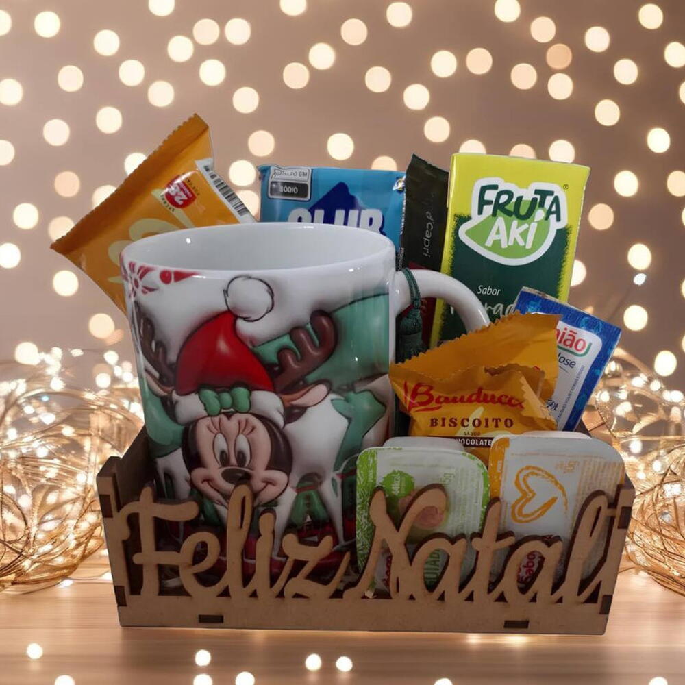 Encante nesse Natal com nossa cesta mini Encanto Feliz Natal! Personalizada com a frase Feliz Natal, essa Cesta é um presente que encanta e emociona. Ideal para amigos, familiares e clientes. Surpreenda e encante com este presente repleto de amor e sabor. Itens na Cesta: 1 Caneca Natal - Presente Magico com Mickey e Minnie + 1 Torrada + 1 Clube Social +1 Café + 1 Suco Caixinha + 2 Biscoitos + 1 Açúcar + 1 Adoçante + 1 Margarina + 1 Geleia. . Embalada com saco celofane e lindo laço.